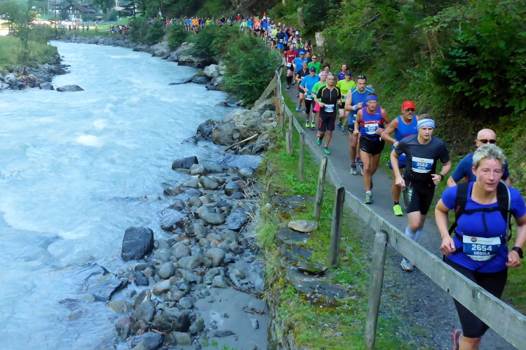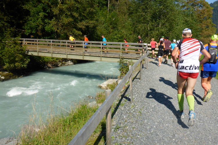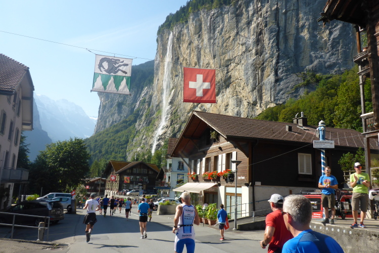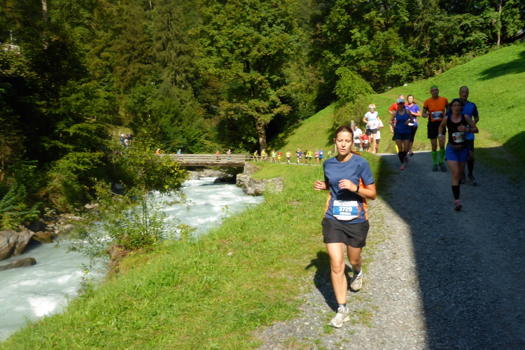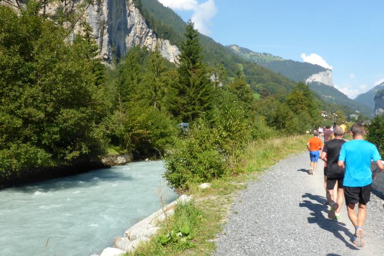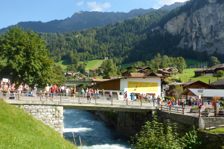 Bei Zweilütschinen treffen die Schwarze Lütschine aus Grindelwald und die Weiße Lütschine aus Lauterbrunnen zusammen. Wir folgen dem rauschenden Wasser der Weißen Lütschine, manchmal auf breiten Wegen, zwischendurch auf Trails. Bald erreiche ich Lauterbrunnen, wo wieder sehr viele Zuschauer und Angehörige von Läufern auf uns warten.