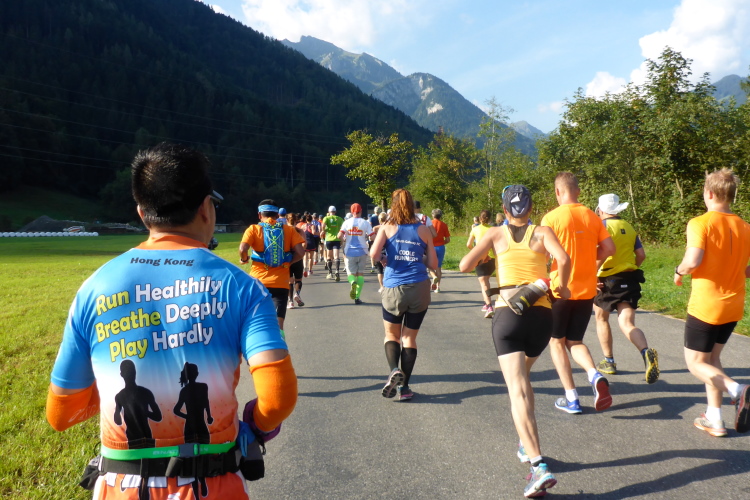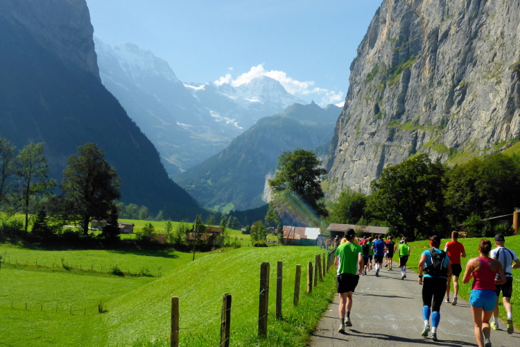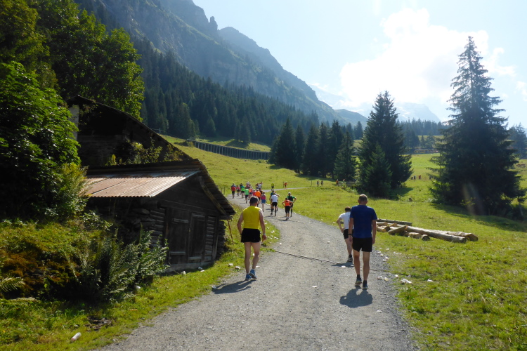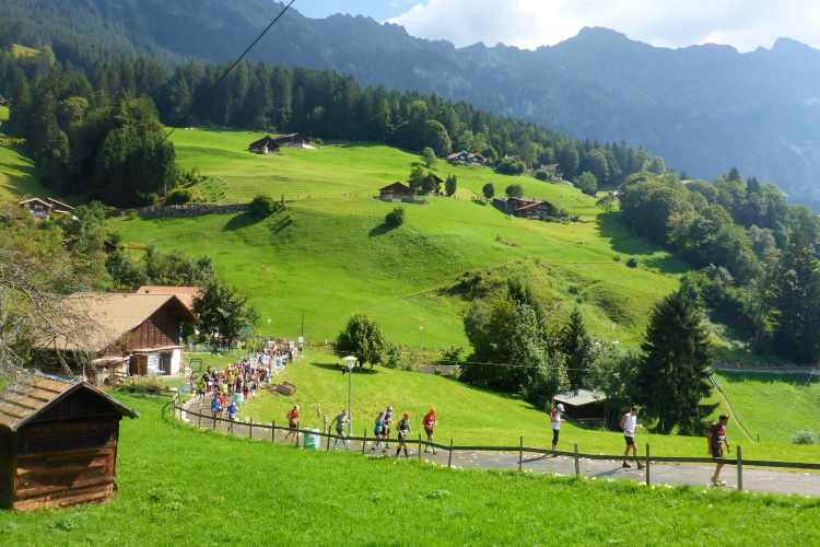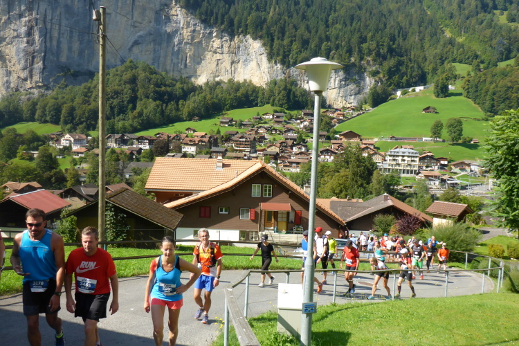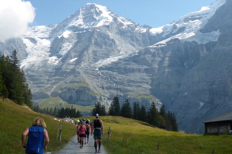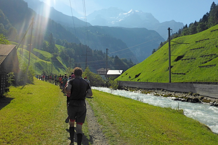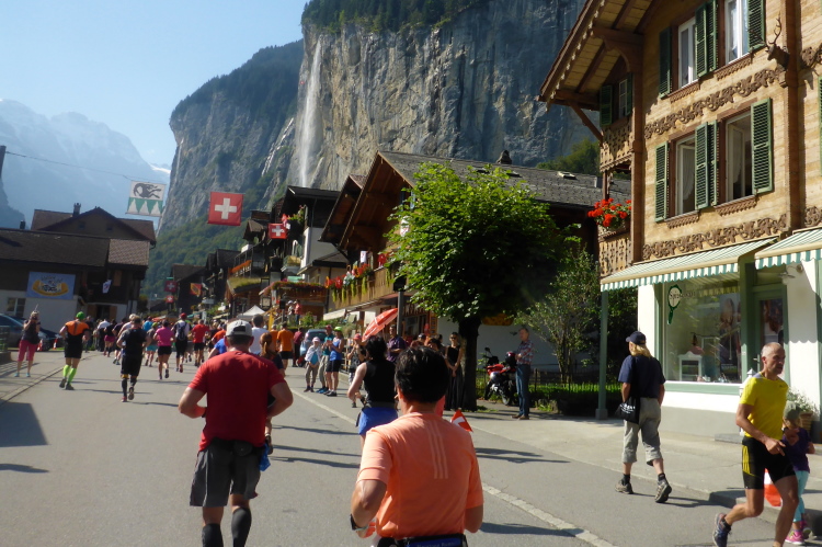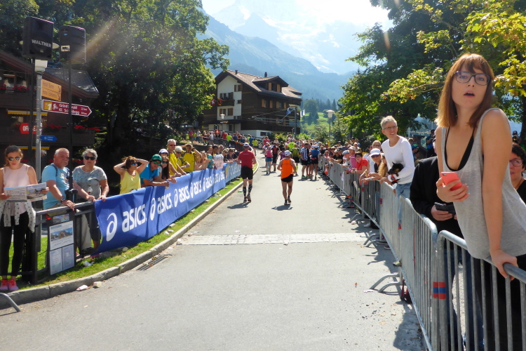 Inzwischen ist es sehr warm, fast zu warm zum Laufen. Es fällt mir schwer, voran zu kommen. Sogar an leichten Steigungen, die ich eigentlich laufen könnte, marschiere ich. Das hohe Anfangstempo und die Temperatur machen mir schaffen. Ein Glück, dass in Wengen sehr viele Zuschauer am Streckenrand stehen und uns anfeuern, denn zu diesem Zeitpunkt würde ich mich am liebsten in den Schatten setzen und ausruhen. Meine kleine physische Krise, die mich fünf Wochen bremst, schlägt nun voll durch. Doch Aufgeben wäre in solch einer traumhaften Umgebung ein unverzeihlicher Fehler! Es warten noch so viele wunderschöne Kilometer auf mich, da muss und will ich unbedingt weiter.