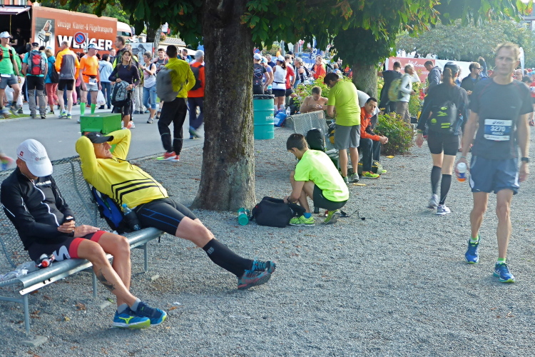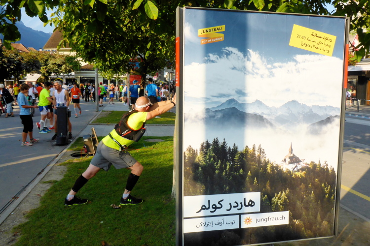 Es macht mir Spaß, anhand der Bekleidung die Herkunft der Läufer zu erraten. Die ganze Welt scheint hier vertreten zu sein. Menschen aus 62 Nationen laufen hier heute, darunter 60 % aus der Schweiz und 15 % aus Deutschland. Der Anteil der Frauen, der 1993 bei 10 % lag, beträgt heute 24 %. 46 % der Teilnehmer laufen hier zum ersten Mal. Vier Läufer kommen sogar auf 26 Teilnahmen, sie starteten beim 10. und 20. Jubiläum, wo der Jungfrau Marathon Samstag und Sonntag gelaufen wurde, an beiden Tagen.