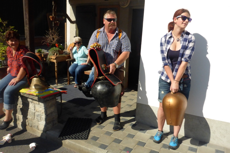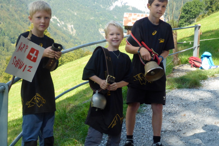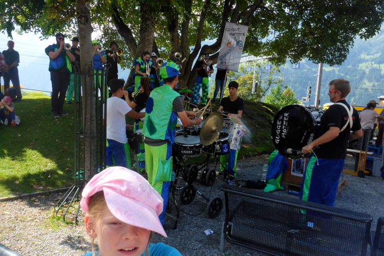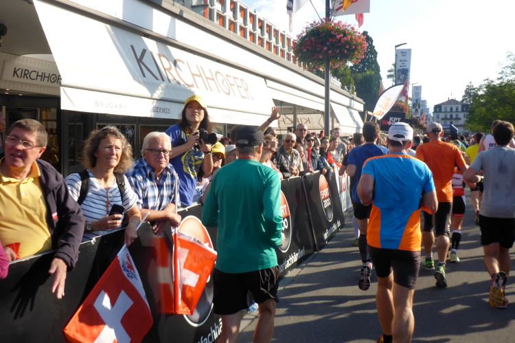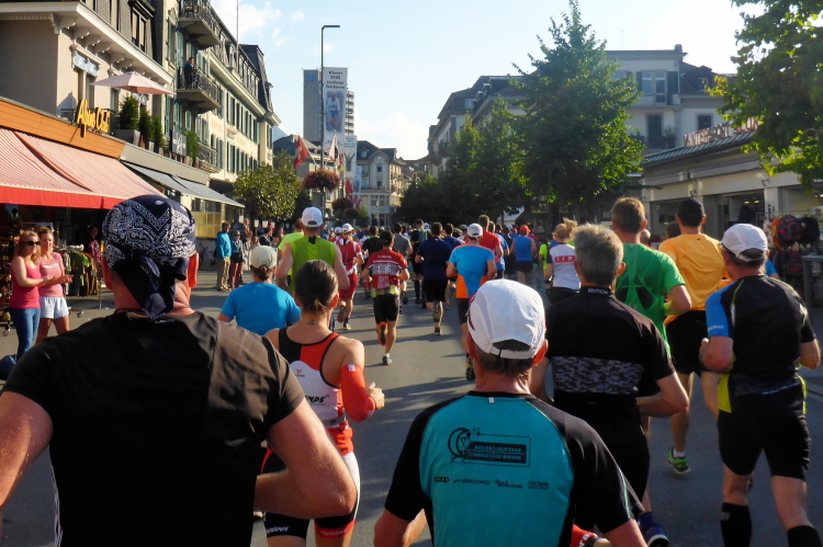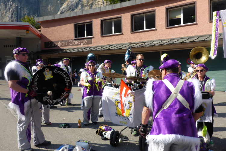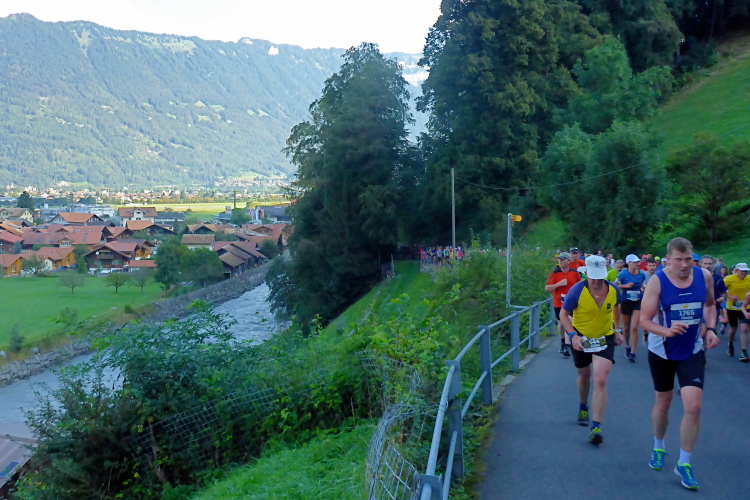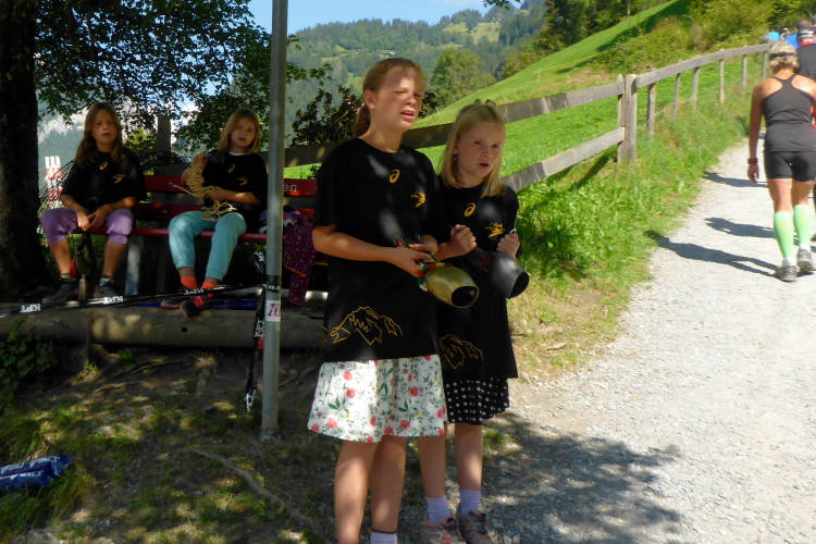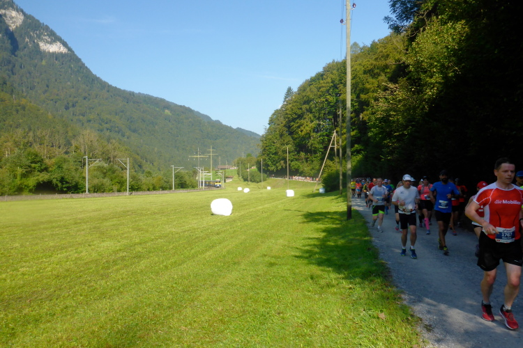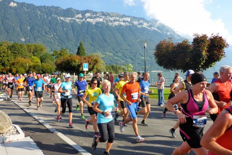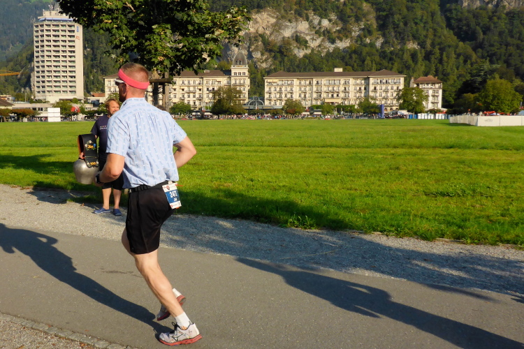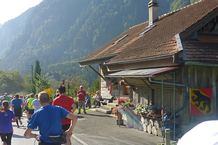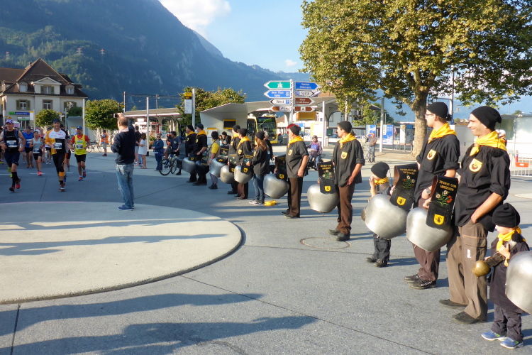 Zuerst laufen wir eine 3-Kilometer Runde durch Interlaken. Die Stimmung auf und neben der Strecke ist hervorragend. Schon hier stehen viele Menschen mit Glocken am Straßenrand. Insgesamt werde ich heute wohl an einigen Dutzend Glocken und Treicheln aller Größen vorbei laufen. Aber auch sehr viele Musikgruppen unterschiedlichster Stilrichtungen säumen die Marathonstrecke.
