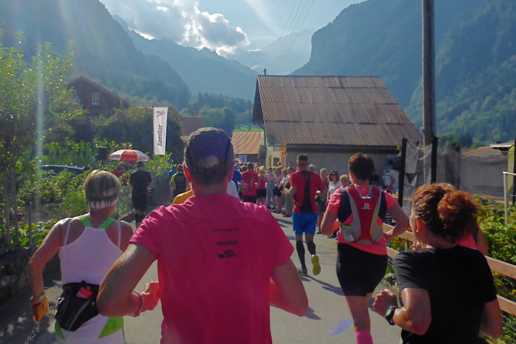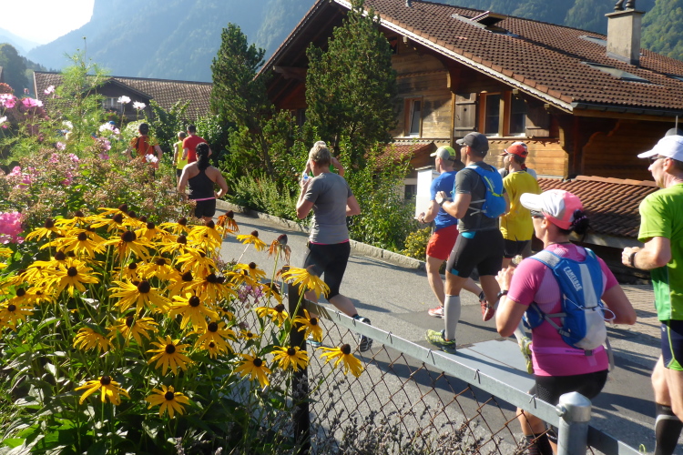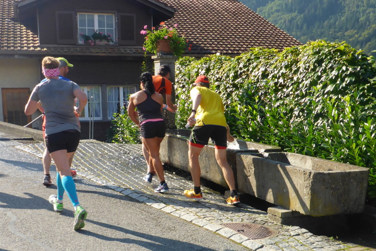 Die Stimmung in den Dörfern ist sehr gut, nach wie vor mit vielen Glocken und Musikern und Anwohnern, die auch nach 24 Jahren noch begeistert die Läufer anfeuern. Auch in Gsteigwiler fühlen wir uns sehr willkommen. Blumengeschmückte Gärten, schöne Holzhäuser, Obstwiesen - noch ist die Umgebung nicht besonders alpin, aber manchmal erkenne ich die Jungfrau vor mir. Über jeden Meter im Schatten bin ich schon jetzt froh. Die vielen Brunnen am Wegrand werden häufig zur Abkühlung genutzt.