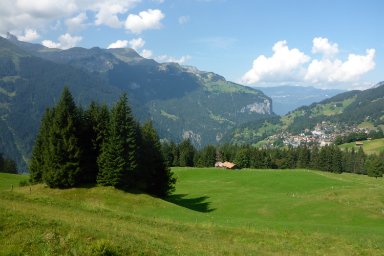 Dann ist diese erste große Anstrengung geschafft. Kurz geht es sogar wieder zum Erholen bergab. Dann folgt ein mäßiger Aufstieg nach Wengen. Hinten im Tal glänzt der Gletscher des Breithorn im Sonnenlicht. Fast alle Gipfel sind wolkenfrei, nur das Schilthorn, auf das im August ein wunderschöner Halbmarathon ab Lauterbrunnen und ein äußerst harter Triathlon ab Interlaken führen, versteckt sich.