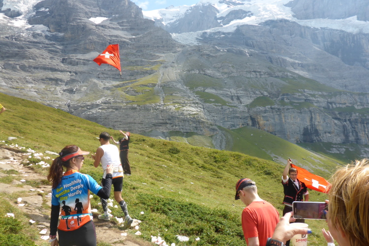 Nun zweigt unsere Route rechts in den Wald ab, durch den wir eine Weile mit nur wenig Aussicht laufen. Dann erblicke ich Mönch und Jungfrau vor mir, bald auch den Eiger. Beim Wixi beginnt der alpine Teil der Strecke. Vor uns die als UNESCO Naturerbe geschützte Eiger-Mönch-Jungfrau-Region, steigen wir auf immer steileren Trails hinauf. Alphornbläser und Fahnenschwinger lenken uns von der Anstrengung ab. Die Gesichter mancher Läufer scheinen vor Begeisterung zu leuchten, in anderen lese ich völlige Erschöpfung, bei mir vereinen sich beide Zustände zu einer euphorischen Kraftlosigkeit.