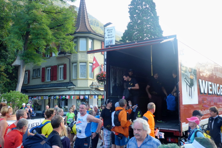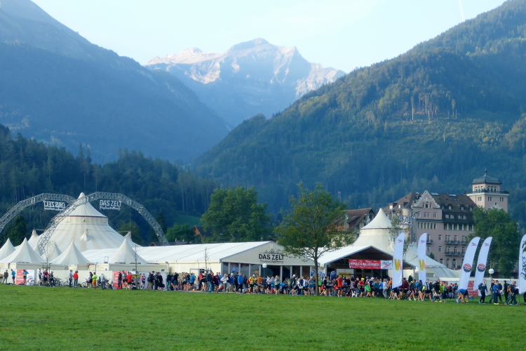 Der Startbereich liegt genau zwischen dem mondänen, über 150 Jahre alten Grand Hotel Victoria Jungfrau und der Wiese mit dem Zelt. Viele Zuschauer säumen die Strecke. Schon jetzt spurt man, dass es heute ein für September ausgesprochen hochsommerlich warmer Tag wird. Vor dem Start werden die Namen aller Teilnehmer, die heute Geburtstag haben, über Lautsprecher vorgelesen. Einige Gleitschirmflieger landen auf der Wiese, dann geht es pünktlich um 9 Uhr los.