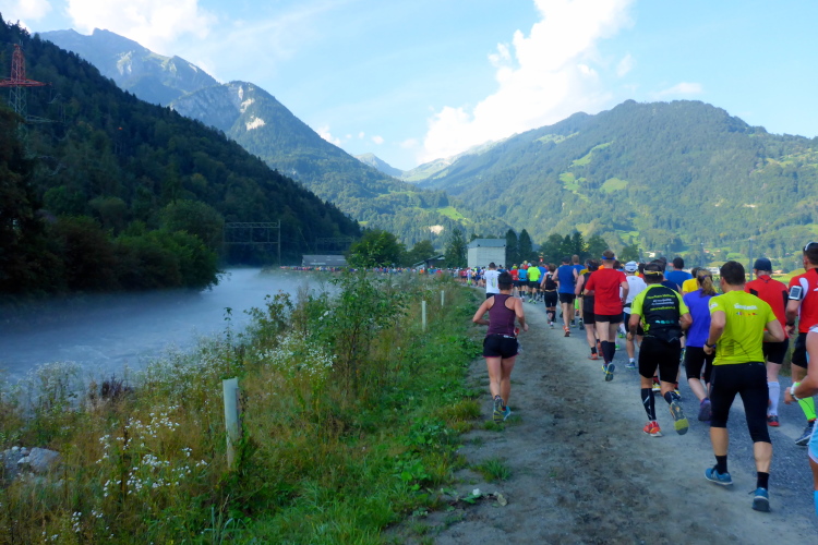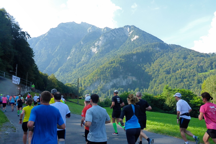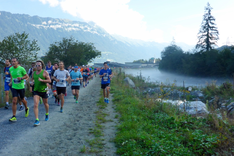 Als meine Freundin und ich vor zehn Jahren hier starteten, war der Jungfrau-Marathon unser erster Lauf, bei dem es auch viele Höhenmeter zu bewältigen gab. Damals waren wir schnelles Laufen in der Ebene gewohnt, hatten aber sehr viel Respekt vor den 1800 Höhenmetern Aufstieg. Heute ist es für mich genau umgekehrt. Nach vielen großen Ultratrails bin ich längere und steilere Aufstiege gewohnt. Mehr als 12 km auf flachem Gelände bin ich schon lange nicht mehr gelaufen. Tempotraining hat Seltenheit. Auf der ersten Streckenhälfte muss ich mich daher für meine aktuellen Verhältnisse nun sputen, um im Zeitlimit zu bleiben.