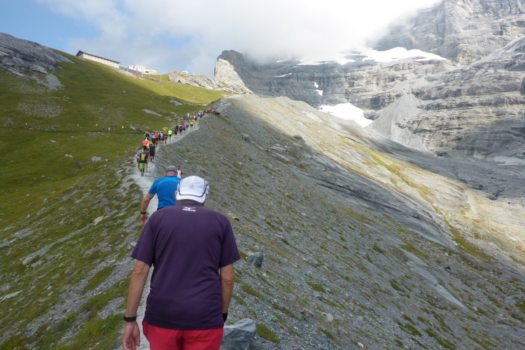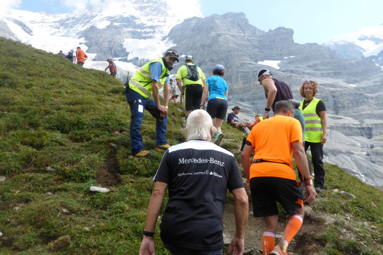Mit Blick auf die Gletscher der Jungfrau geht es weiter bergauf. An jeder Verpflegungsstelle trinke ich mindestens einen Becher, meist sogar zwei. Bouillon ersetzt das herausgeschwitzte Salz, dazu freue ich mich über Cola, feste Nahrung will mein Magen heute nicht akzeptieren.