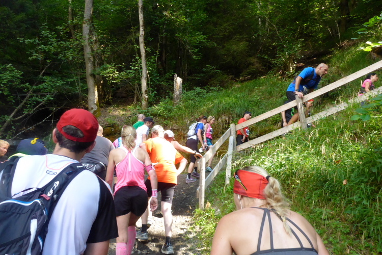 Ab km 25,5 kommt ein Abschnitt, der mich vor zehn Jahren sehr gefordert hat. Heute dagegen ist es genau das, was ich am meisten liebe - ein steiler Aufstieg. 500 Höhenmeter auf nur sechs Kilometern, da ist Wandern statt Laufen angesagt. Die Serpentinen werden von vielen "Die Wand" genannt. Deshalb läuft seit Jahren in entsprechender Lautstärke Pink Floyds "Another Brick in the Wall" als Endlosschleife und motiviert auch die Teilnehmer, die hier erschöpft am Geländer lehnen oder auf dem Boden sitzen.