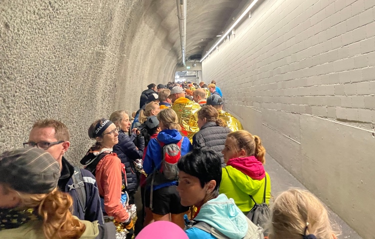 Alle, die mit mir die Ziellinie überqueren, haben auch schon mal dynamischer ausgesehen. Dann bekommen wir Medaille, Wärmeschutzfolien, T-Shirt und Getränke gereicht. Auf einer Plattform sind Bänke aufgestellt, die bei klarer Sicht zum Verweilen einladen würden. Ich bin aber trotz der Anstrengung durchgefroren und betrete lieber die Bergstation Eigergletscher auf 2.320 m Meereshöhe, um mit dem Eiger-Express, einer 2020 erbauten Seilbahn (und Grund für die Verlegung des Ziels) hinunter nach Grindelwald zu fahren, wo unsere Effektensäcke auf uns warten.