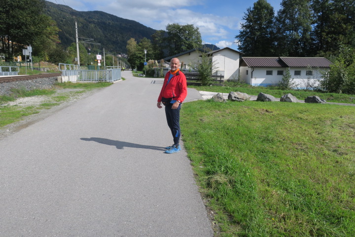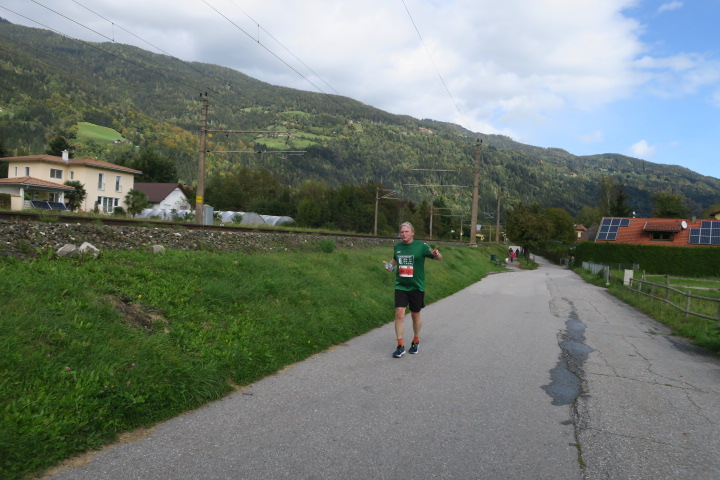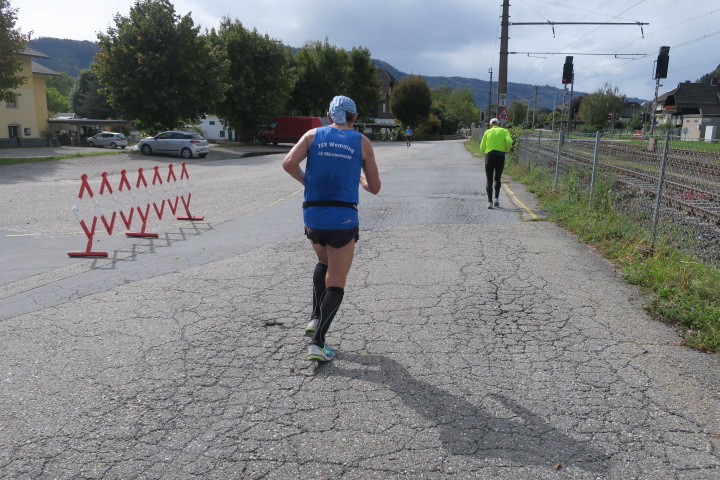 Beim Gasthaus Laggner in Steindorf, dessen Ortsgebiet eigentlich auf der anderen Seite der Straße hangaufwärts liegt, beginnt die 7 km Wendepunktstrecke (je 3.5 km in eine Richtung) auch für uns. Ich habe so Gelegenheit, entgegenkommende Kolleginnen und Kollegen von vorne ins Bild zu bekommen. Einige winken mir zu, andere lächeln. Es könnte sein, dass so mancher mich irgendwie zuordnen kann.