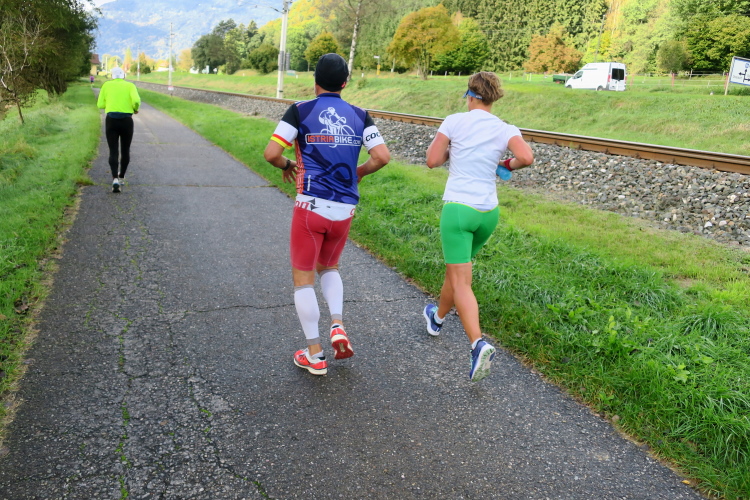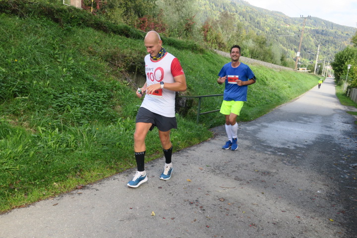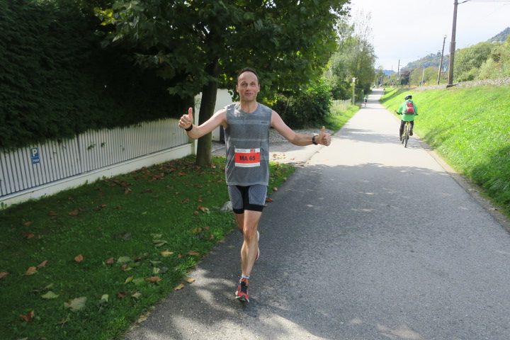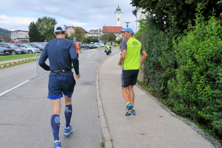 Helmut hat sich einen Vorsprung von 500 m herausgearbeitet. Doch bei der Labe beim Gasthof Laggner treffe ich ihn wieder. Er lässt sich Zeit und regeneriert. Ich bleibe nicht stehen, sondern nehme den Becher Wasser mit Iso gemischt mit. Als feste Nahrung gibt es Bananenstücke. Die kurze Pause hat bei Helmut neue Energie aktiviert, er rückt wieder auf. Es sieht danach aus, dass er sein eigenes Tempo gefunden hat, das über dem meinigen liegt. Er zieht erneut davon, bei der Labe am späteren Wendepunkt zu den letzten 6 km sehen wir uns erneut. Am Radweg Richtung Ossiacher See laufen wir gemeinsam. Inzwischen sind zahlreiche Läufer der 2. Startgruppe um 9:45 Uhr nachgekommen und setzen zum Überholen an.