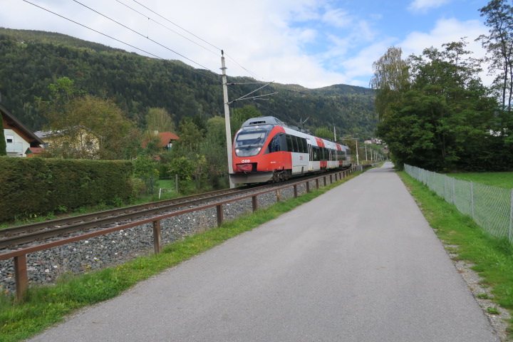 Der eigentliche Begegnungsverkehr erfolgt von hinten, uns überholen laufend die Kollegen vom Start. Auch einige 50 km-Läufer mit weißer Startnummer, die etwas früher als wir abgelassen wurden, kommen hinten nach. Auf dem Radweg R2 geht es westwärts Richtung Ossiacher See. Zwar sehe und höre ich keine Eisvögel, Kraniche, Weiß- und Schwarzstörche, Fisch- und Zwergadler, Windelschnecken, Fledermäuse, Schmetterlinge und Amphibien, aber schön ist die Wasserlandschaft allemal.