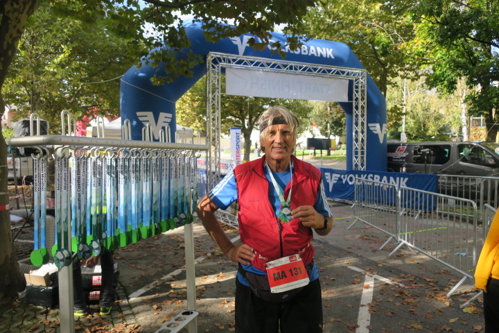 Ich folge einer Gruppe sportlich aussehender jüngerer Leute zum Stadtsaal. Am Eingang misst ein Sanitäter vom Roten Kreuz die Temperatur, hernach muss man ein Formblatt lesen und durch Unterschrift bekräftigen, dass man keine Corona-Symptome hat. Der Andrang in den Stadtsaal, wo Maskenpflicht herrscht und ein Abstand von 2 m einzuhalten ist, ist gering. Nach Übergabe der Startnummer mit aufgeklebtem Chipstreifen auf der Rückseite wird mir eine prall mit Goodies gefüllte Papiertasche überreicht. Auf den Kauf eines T-Shirts habe ich verzichtet, denn ich habe im Laufe von zwei Jahrzehnten Hunderte angesammelt, die ich nie tragen werde.