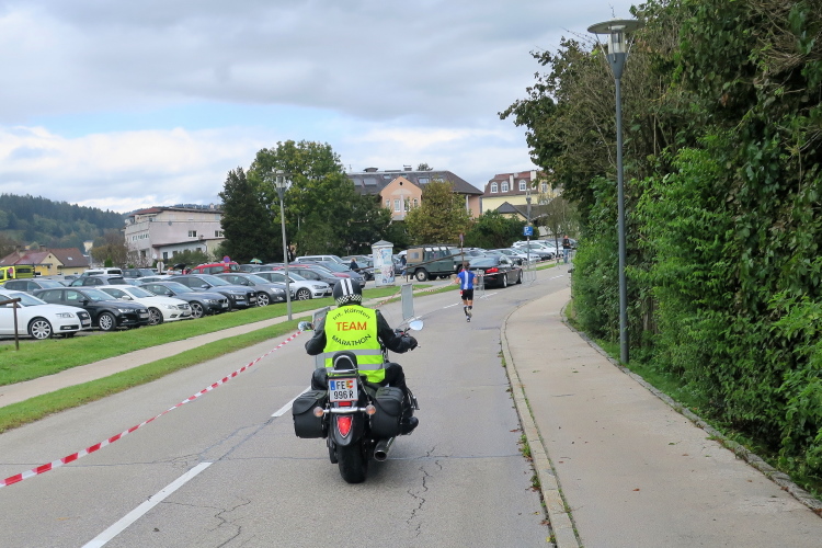 Es ist noch ein langer Weg vorbei am Domenig Steinhaus, am Eishockeyzentrum Ossiacher See, am Kurpark Bodensdorf und retour, zu bewältigen. Helmut zieht wieder davon, ich kann und will seinen „Zwischenspurts“ nicht folgen, sondern habe heute schon nach 15 km die Power verloren. Auf dem Rückweg kommen mir bekannte Gesichter entgegen, Börnie Keiler, Jg. 1958 und auf 4:30er-Finisherzeiten bei flachen Marathons geradezu abonniert, kurz darauf Herbert Orlinger, ebenfalls aus der 2. Startgruppe und ganz am Schluss der weithin bekannte Marathonsammler Karl-Alfred Erber aus St. Pölten, stets mit einem Trikot der Frauenhandballmannschaft von Hypo NÖ unterwegs.