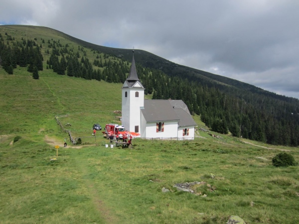 Die Aussies Stephen und Tara sind nun wieder zurückgefallen. Ich erreiche die Wallfahrtskirche Maria Schnee am Gleinalmschutzhaus, wo sich die die 4. Labestelle befindet. In der Kirche werden Bergmessen an Wochentagen und an Sonntagen gefeiert. Die Kirche wurde im Oktober 2004 von einem Blitz getroffen und brannte bis auf die Grundmauern ab, nur der Altar blieb vom Feuer verschont. Im darauffolgenden Jahr wurde sie restauriert und wiederaufgebaut.