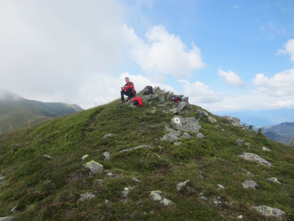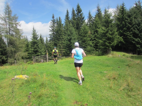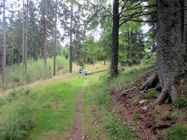 Bei Kilometer 18 ist der höchste Punkt des Bergmarathons erreicht. Zwei Helfer stehen dort, die u.a. auch für den Fall einer Verletzung eines Läufers postiert sind. Es geht nun zügig abwärts, wobei die Geländestufen ziemlich steil sind und die Übergänge Tiefen von einem halben Meter und mehr aufweisen. Ich riskiere auf so einem Terrain nichts, sondern bewege mich vorsichtig nach unten.