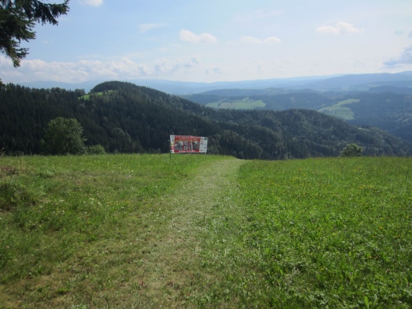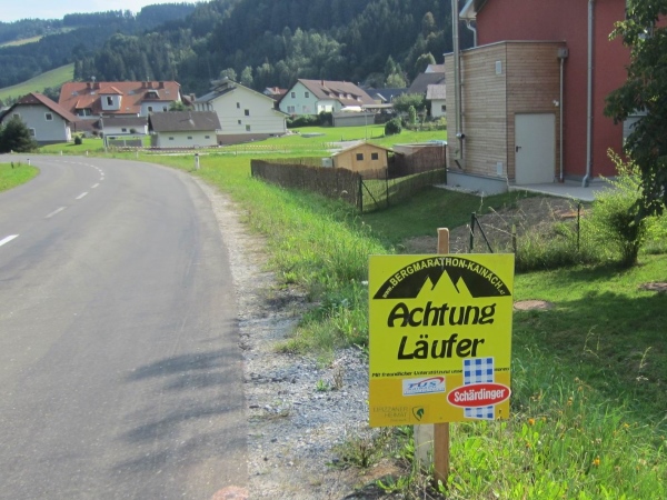 Über eine steil abfallende Wiese geht es vorbei an einer großen Tafel, die den heutigen Marathon bewirbt, nach unten vorbei an einem Bauernhof. Eine Quellwasserleitung mit Zapfhahn ermöglicht mir ausgiebig zu trinken, denn die nächste Labestelle wird erst wieder bei km 35 auftauchen.