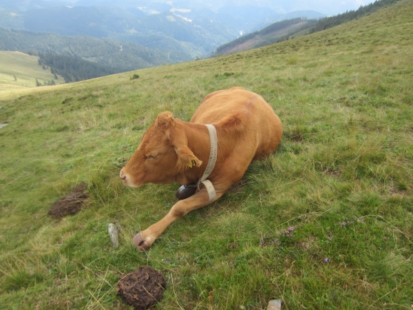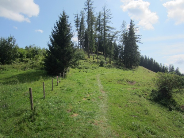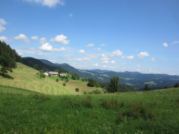 Es dauert wieder lange, bis ich zunächst zur 30 km-Marke komme und dann 32 km erreiche. Die immer wieder kehrenden Gegenanstiege kosten Kraft und bremsen. Aber die Landschaft ist atemberaubend schön, besonders für einen Städter, der dadurch seine Herkunft wieder entdeckt. In der Ferne sehe ich entlang eines Anstiegs auf eine Weide die Aussies und den Wiener Kollegen, knapp davor auch die Deutsche Bianca mit der langen Warmhaltehose als Markenzeichen. Sie haben ca. 2 km Vorsprung, das sind nun schon 15-20 Minuten, je nach dem Grad der Steigung.
