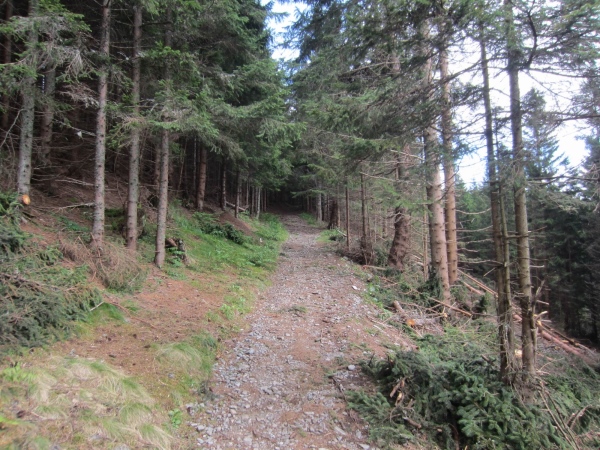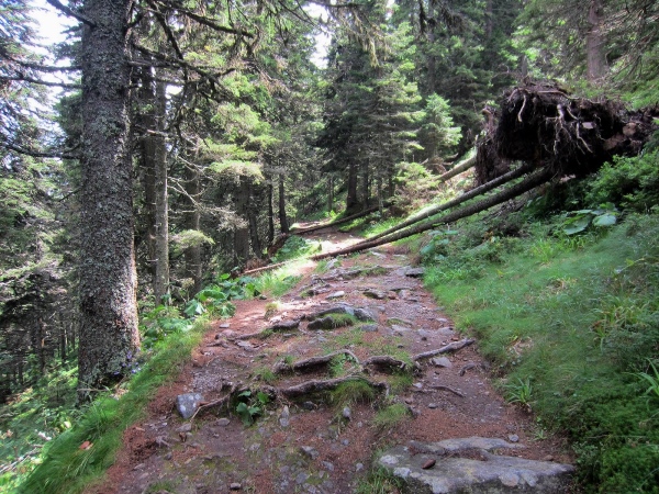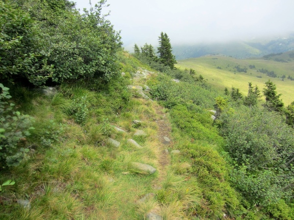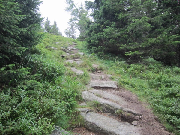 Ich bewege mich trotzdem so schnell ich kann weiter, Gehen und Laufen wechseln sich ab. Nun folgt wieder eine Abwärtspassage, auf der man wegen der vielen zum Teil großen Steine aufpassen muss, nicht auszurutschen und zu stürzen. Mehrmals bin ich schon gestolpert, meine Trailschuhe haben zwar eine Profilsohle, doch auf nassen Steinen bieten sie kaum Halt.