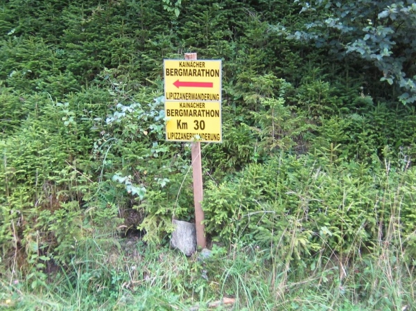 Ich halte mich an der Labe nicht lange auf. Die Strecke führt nun durch den Wald, bis endlich Kilometerpunkt 20 angezeigt wird. Ich blicke zurück, kein anderer Läufer ist weit und breit zu sehen. 3 Stunden und 6 Minuten bin ich bislang unterwegs, noch weitere 24 km wegen der Überlänge des Marathons sind ausständig. Die 7 Stunden könnten zu einem Prüfstein werden, aber fast 4 Stunden habe ich noch Zeit.
