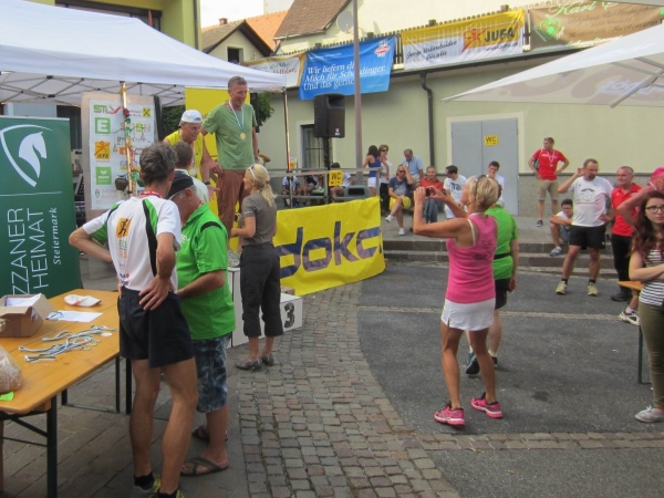 Ich bleibe nach dem Duschen noch eine gute Stunde bei der Siegerehrung. Einige Läufer haben gleich drei Medaillen umgehängt, österreichischer und steirischer Meister sowie in der Mannschaftswertung. Schon letztes Jahr habe ich in meinem Bericht mit Bedauern festgestellt, dass es keine offizielle Medaille gegeben hat. Leider hat man auch zum 25-Jahresjubiläum keine herstellen lassen. Eine gediegene Erinnerungsmedaille hätte die Teilnehmer aus Übersee sicher auch gefreut.