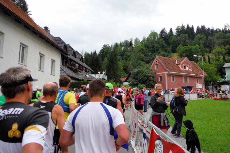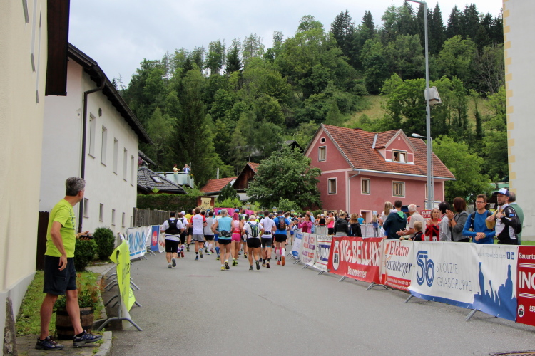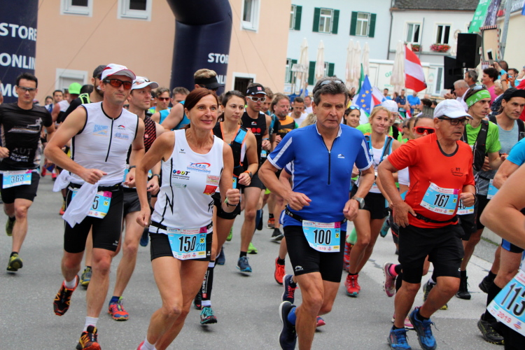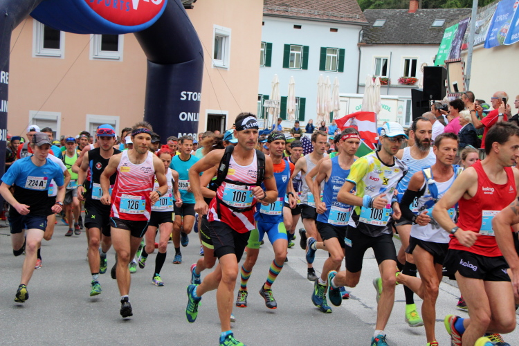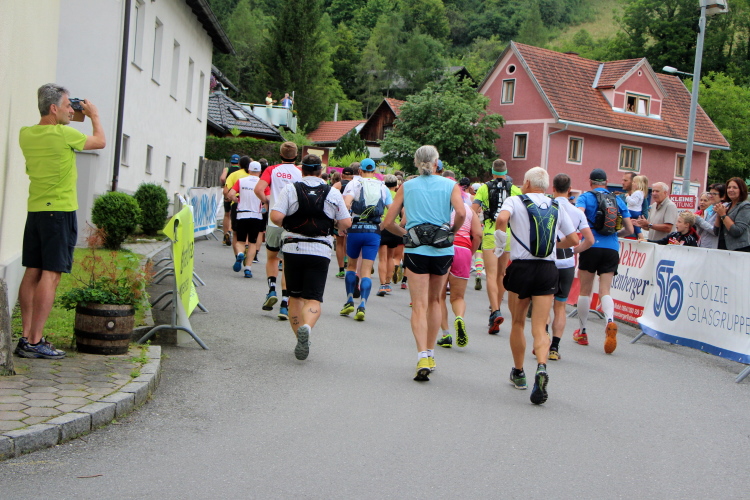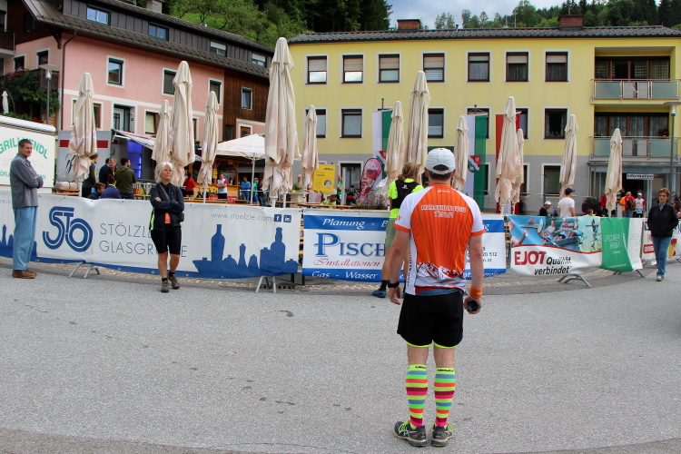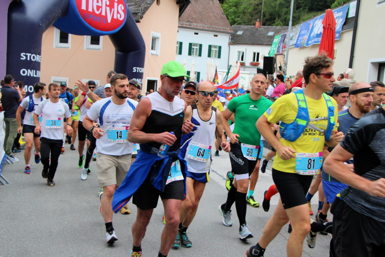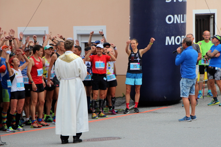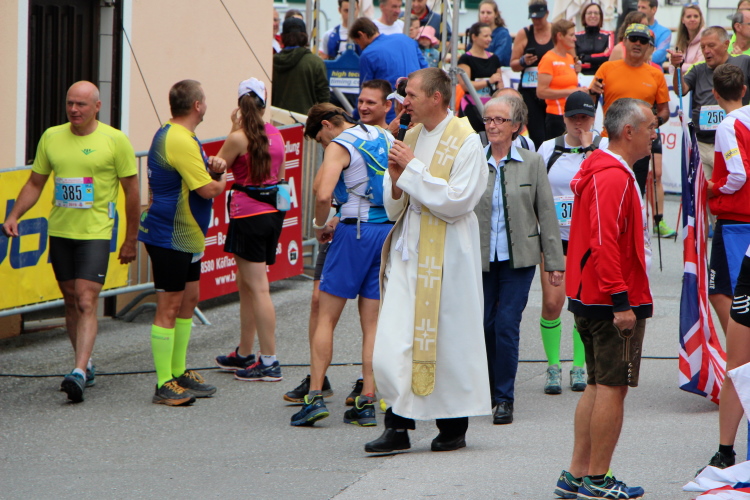 Pünktlich versammelt sich die Läuferschar im Start- und Zielbereich auf dem Dorfplatz. Die Kinder schwenken schon mal verschiedene Fahnen als Hinweis auf die Internationalität der Veranstaltung. Tatsächlich hat es Teilnehmer u. a. aus Polen, Russland, Ungarn und den USA hierher verschlagen. Jeder wird willkommen geheißen, auch die Deutschen, obwohl bezweifelt wird, ob sie den Bergen gewachsen sind. Was ist dann erst mit den Holländern und Dänen, die statt Berge nur Hügel aufzuweisen haben. Wir werden den Beweis liefern, dass man nicht Österreicher sein muss, um über die Berge zu kommen. Einfach wird es sicher nicht, denn 1.800 Höhenmeter sind ausgeschrieben und den Qualipunkt für den UTMB gibt es auch nicht umsonst. Damit es auch ganz sicher klappt, gibt uns der Pfarrer seinen Segen. St. Georg und St. Christopherus sollen uns sicher über die Strecke helfen.