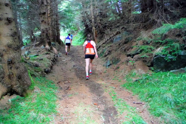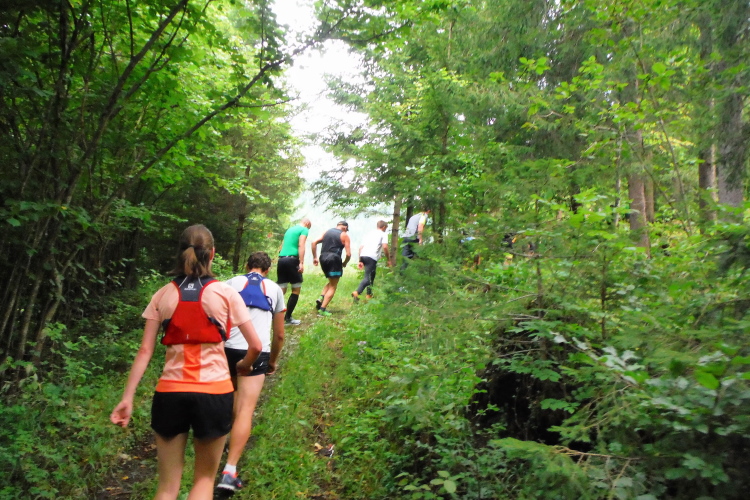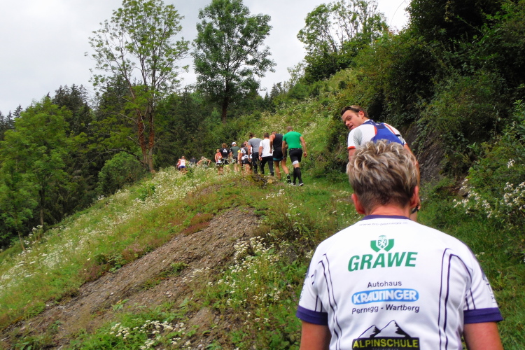 Pünktlich werden wir auf die Laufstrecke entlassen. Ich bin vorsichtig und befinde ich mich deshalb schnell im hinteren Teil des Feldes. Die ersten 1,5 KM sind flach, weshalb ich durchaus schneller anlaufen könnte. Wer hier zu schnell läuft, wird auch schnell ausgebremst, denn jetzt beginnt der Anstieg. Zwei Drittel der versprochenen Höhenmeter erwarten mich auf dem ersten Drittel der Strecke, also über 1.200 Meter. Der Läuferlindwurm bewegt sich wandernd vorwärts, überholen ist auf dem Trail kaum möglich. Gut, so werden Kräfte für später gespart.