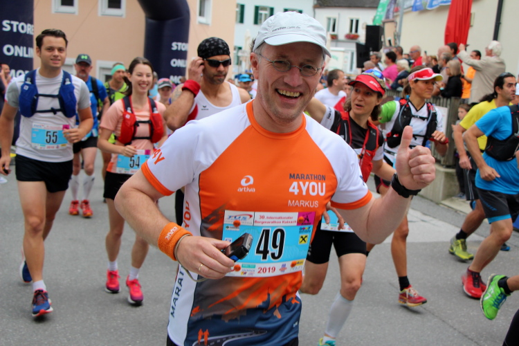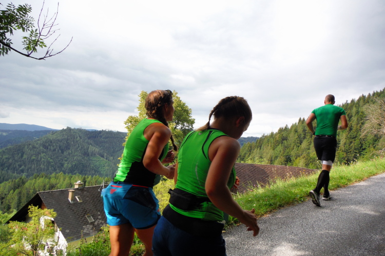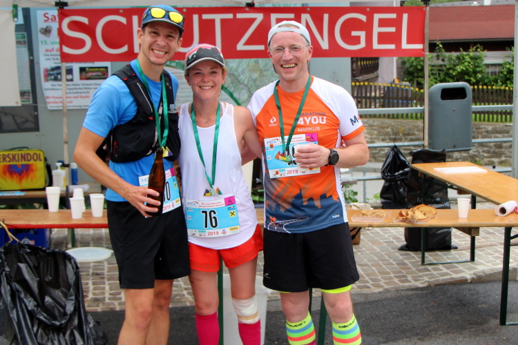 Zur Belohnung hole ich noch zwei Läufer ein und erreiche Kainach. Der Kirchturm auf dem Dorfplatz winkt bereits, aber der Veranstalter gönnt mir noch zwei zusätzliche Kilometer. Natürlich noch einmal bergauf. Noch einmal ein wenig Trailrunning, dann warten am Ortsrand ts Fahnen schwenkend die Kinder. Ich leihe mir die Deutschlandfahne und laufe entspannt ins Ziel.