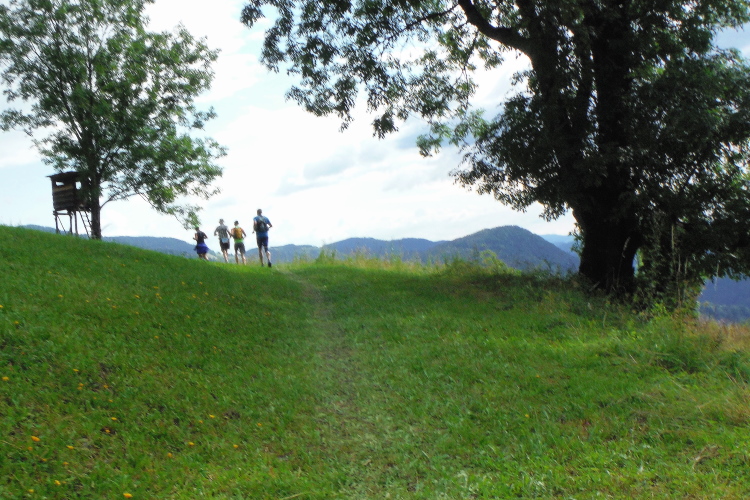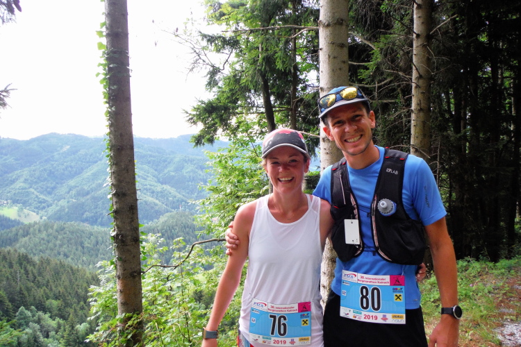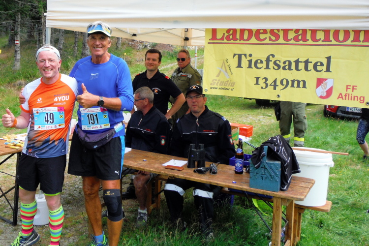 Nach der Labe bei KM 19 geht es über eine Wiese in das nächste Waldstück. Nicht steil, dafür aber derart steinig, dass selbst der Mountainbiker absteigt. Konzentration ist gefragt, aber bereits einen Kilometer weiter darf ich wieder einen gut zu belaufende Feldweg genießen. Auf dem Weg hinab zum Tiefsattel schaffe ich es tatsächlich, auf den Läufer vor mir aufzuschließen. Er kommt mir irgendwie bekannt vor. Und tatsächlich, ist es Kollege Anton Reiter, an sich der angestammte Reporter bei diesem Lauf. Knieprobleme haben ihn zuletzt außer Gefecht gesetzt, aber einen seiner Lieblingsmarathons wollte er nicht versäumen. Wir unterhalten uns und nehmen die nächsten Steigung gemeinsam, ehe ich mich nach vorne schicken lasse.