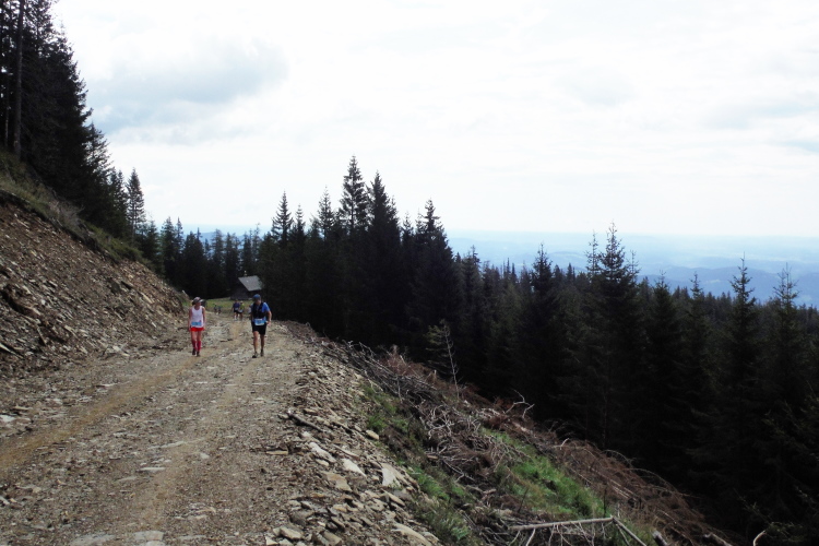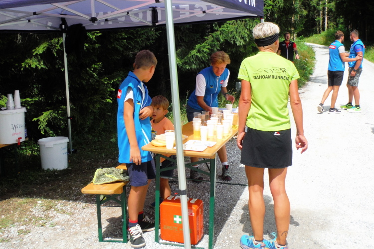 Bei KM 11 erreiche ich die Labestation Aiblhütte. Auf 1.450 Metern steht die schmucke Jagdhütte. Die nächsten Kilometer führen weiter hauptsächlich über Schotter. Die Wälder werden lichter, die Aussichten noch schöner. Bei KM 14 wird die Zeit genommen. Auf dem freien Bergrücken bremst mich der angesagte Nordostwind. Auf diesem Stück wäre eine Jacke gut, sonst ist das Wetter sehr angenehm zum Laufen. Auf den letzten Metern zur Hütte laufe ich auf einem kleinen Begegnungsstück. Fröhlich winken die vorauslaufenden, dann habe ich den nordwestlichsten Punkt des Tages erreicht. Hier wechseln die Staffeln zum ersten Mal.