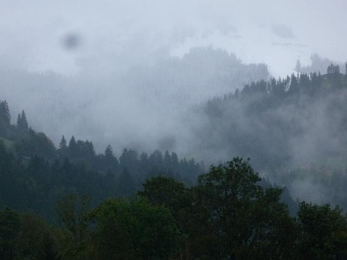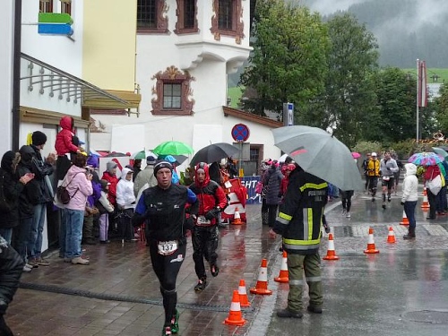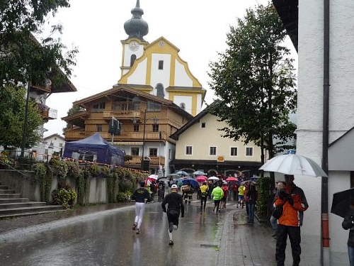 Dann der Startschuss und los geht es. Wie gestern geht es im Galopp die Hauptstraße von Söll hinunter, begleitet von den Anfeuerungsrufen der wetterfesten Zuschauer. Über die ersten 3,5 km muss ich nicht viele Worte verlieren, denn hier folgt die Strecke derjenigen, die wir schon vom gestrigen Zehner kennen, nur mit einem kleinen zusätzlichen Schlenker oberhalb des Dorfes. Dann sind wir zurück in Söll und werden beim erneuten Kreuzen des Startplatzes abermals lautstark empfangen. Nach dieser Einlaufschleife steht der Hauptteil der ersten Runde an: Der Weg hinauf nach Hochsöll.
