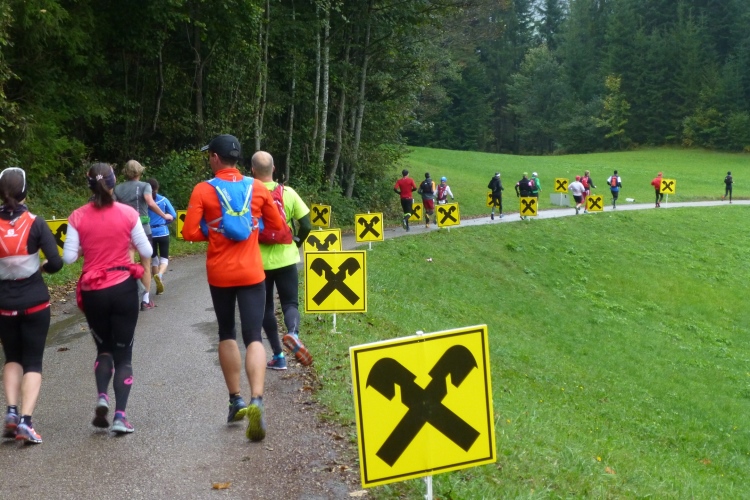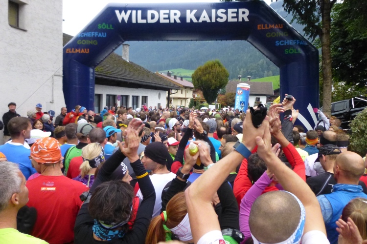 Fast auf den Meter genau so viele Höhenmeter – und zwar 2.345 – hält der der Marathonkurs für uns bereit. An die 200 Höhenmeter weniger waren es noch 2013. Seinerzeit führte der Kurs via Scheffau und Ellmau über reichlich Asphalt bis km 21 erst einmal ziemlich flach dahin, ehe er hinauf zum Hartkaiser und weiter zur Hohen Salve sein Gesicht als Berglauf offenbarte. Das hat sich seit einer Runderneuerung anlässlich des Jubiläumslaufs im letzten Jahr geändert. Weniger Asphalt, mehr Trail lautete die Devise, und das bedeutet auch ein paar Anstiege mehr. Ich bin schon gespannt. Sieben Stunden haben wir dafür Zeit. Bummeln ist da nicht angesagt.