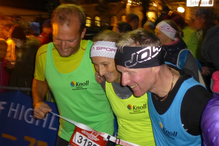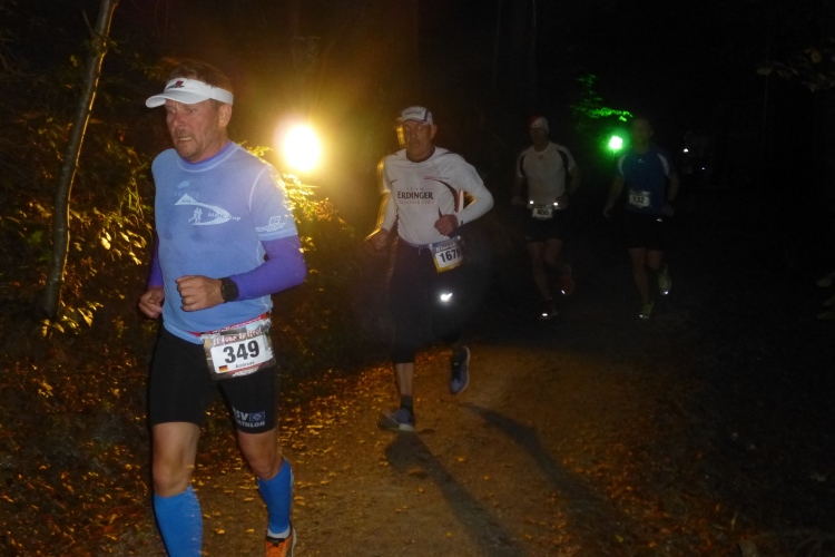 Klingt nett, ist es auch. Aber das ist es nicht, was den Lauf bemerkenswert macht. Seinen speziellen Charme bezieht der 10er aus der Atmosphäre, in der er stattfindet. Da ist zum einen der Umstand, dass er just in der Stunde stattfindet, in der der Tag zur Nacht wird. Nach dem Massenstart um 18 Uhr kann man sehr plastisch erleben, wie sich von Runde zu Runde die Schatten der Nacht über die Landschaft legen. Farbige Strahler leuchten den Weg durch die Waldpassagen mystisch aus. Das hat was. Zum anderen ist es die Stimmung im Ort, die wir beim Einlauf zum Ende einer jeden Runde erleben dürfen. In dichtem Spalier erwarten uns die Zuschauer entlang der Straßen, begleiten uns applaudierend und bereiten uns ein rauschendes Finish. Über 600 sind es, die sichtlich euphorisiert heute den Zielbogen queren.