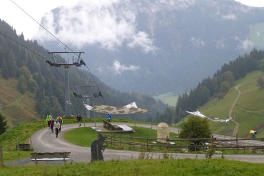 Nach 3,7 km ist ganz plötzlich der Wald zu Ende. Wir treten hinaus auf die Lengfeldalm. Und vor mir sehe ich nur eine Wand. Keine graue Fels-, sondern eine grüne Wiesenwand, auf der sich wie gemalt Ketten bunter Punkte im langen Zickzack über 150 Höhenmeter jäh nach oben bewegen. Uff, zum Glück kommt das erst jetzt. Und weil das Ganze recht fotogen ist, habe ich immer wieder ein Alibi für einen kurzen Zwischenstopp. Langsam trotte ich mit der Karawane Kehre um Kehre in luftige Höhen. Aus der Vogelperspektive schaut das Ganze nicht minder beeindruckend aus.