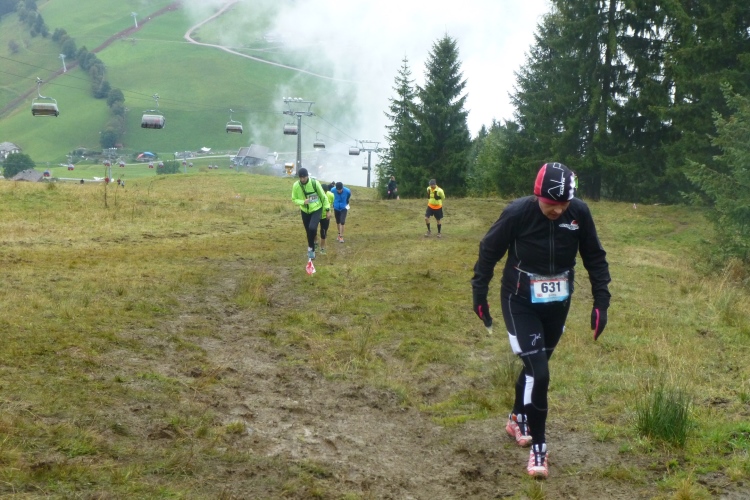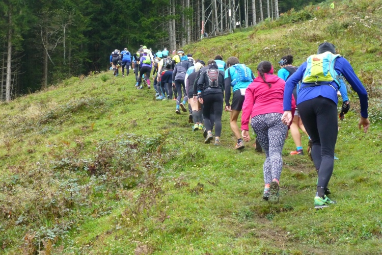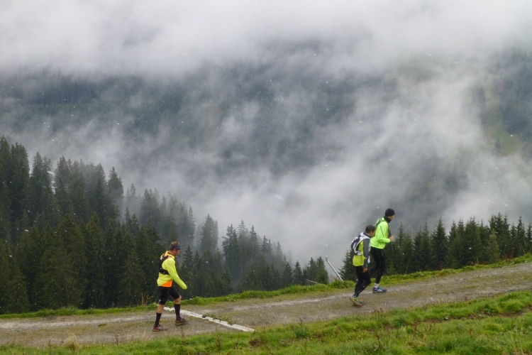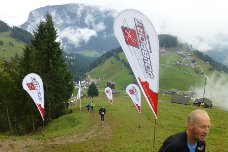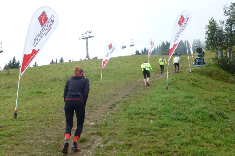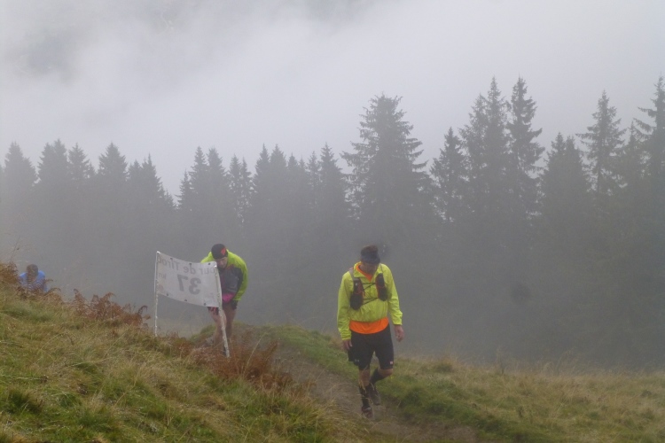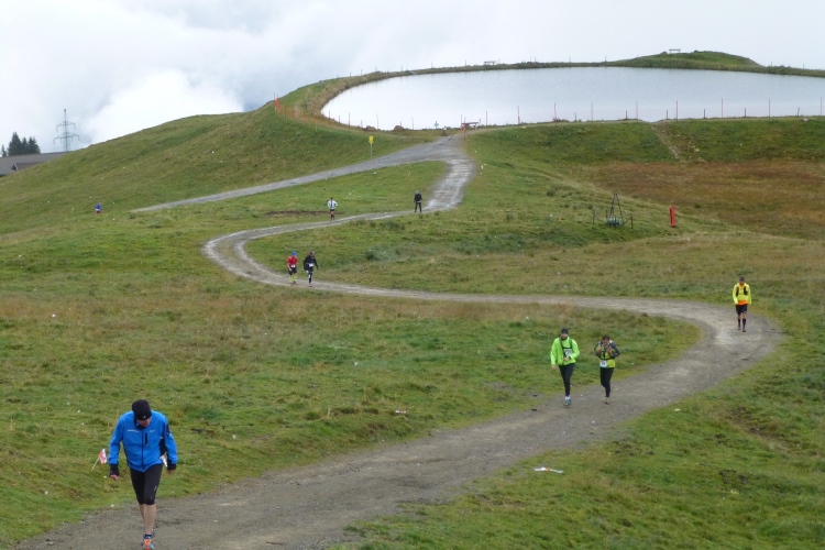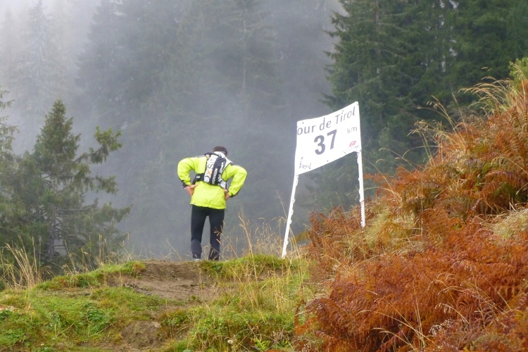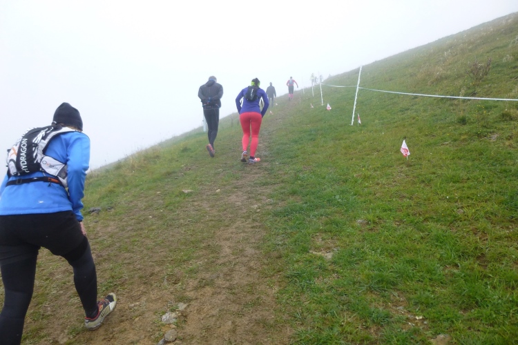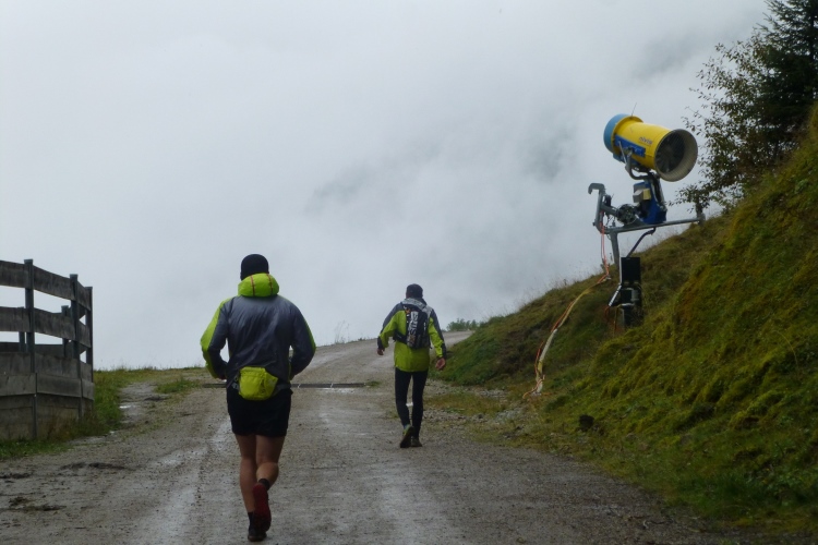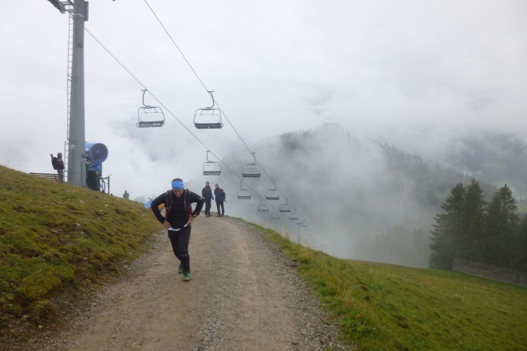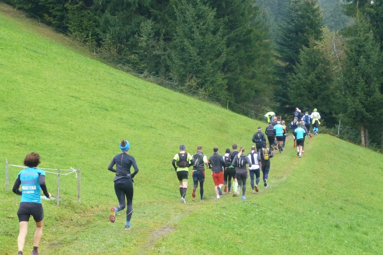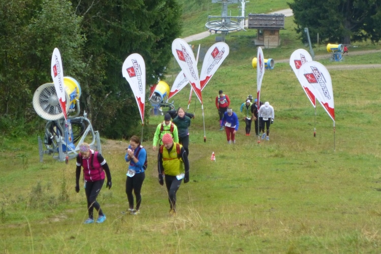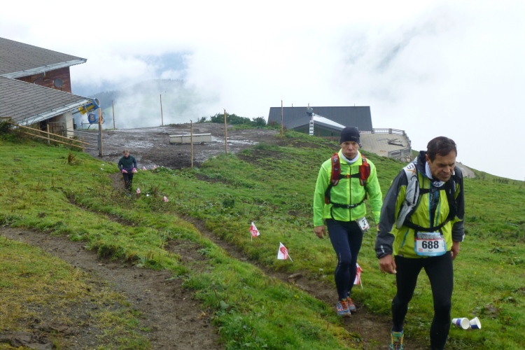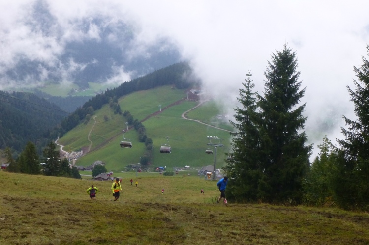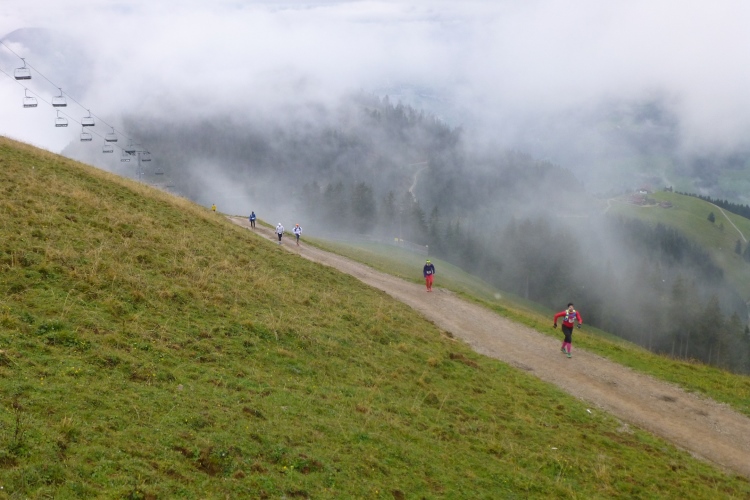 Darauf eingestellt bin ich schon, dass der Anstieg ein paar ganz spezielle Passagen bereit hält. Und eine solche erwartet uns gleich hinter dem 36 km-Schild. Direkt und schnurgerade geht es über das schon matschige Gras die steile „schwarze“ Skipiste empor. Fahnen säumen wie Slalomstangen den Weg. Der Vorteil: Wir gewinnen schnell an Höhe und Ausblick. Der Nachteil: Die Wolken von oben kommen ebenso schnell wieder näher. Fast 20 Minuten bin ich bis zur nächsten Kilometermarke unterwegs. Es beruhigt mich ein wenig, dass die meisten anderen auch nicht schneller sind.