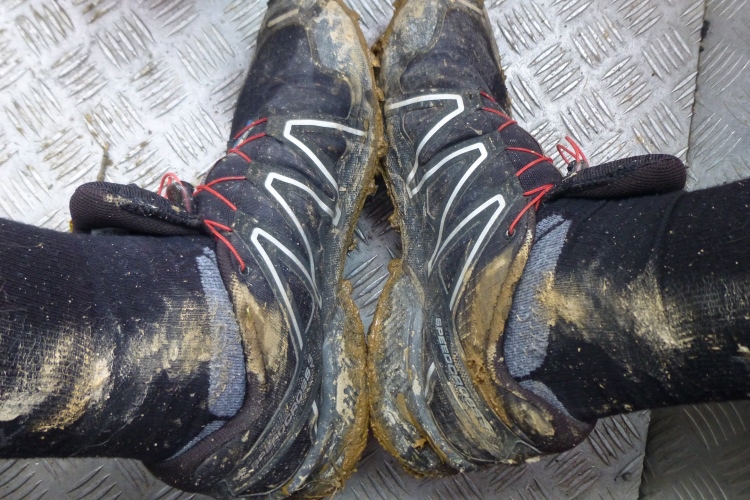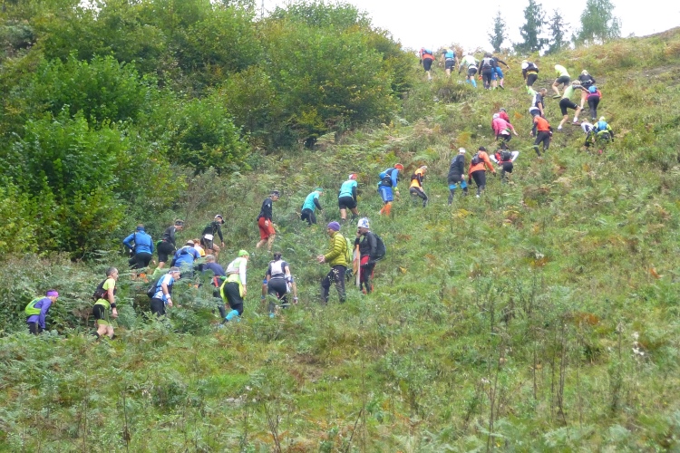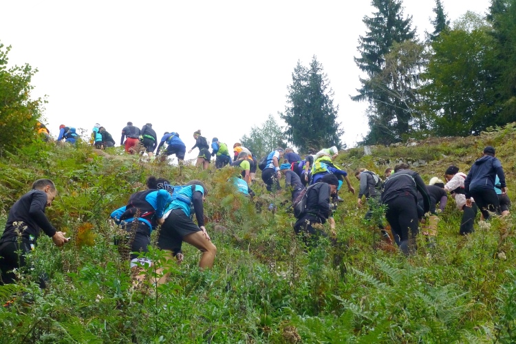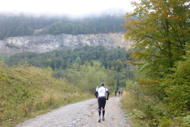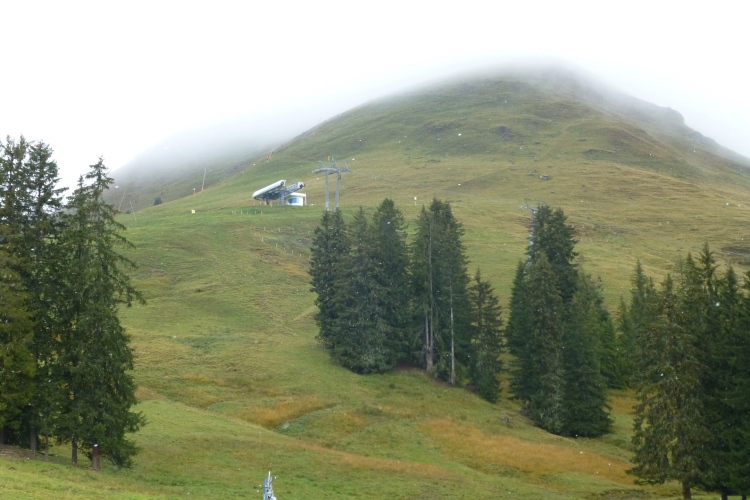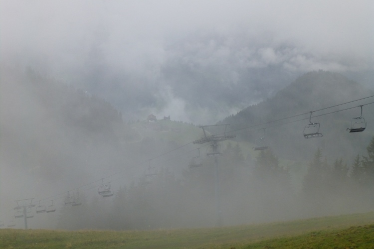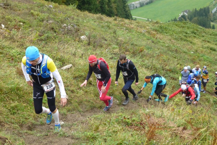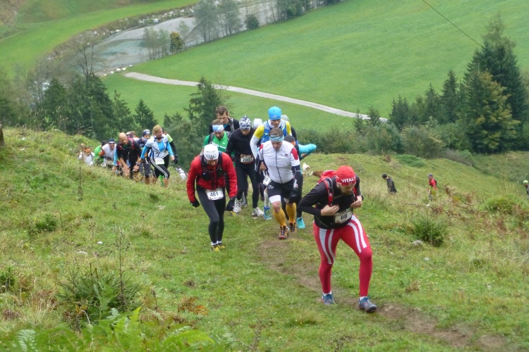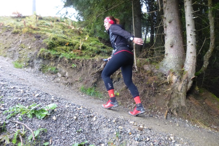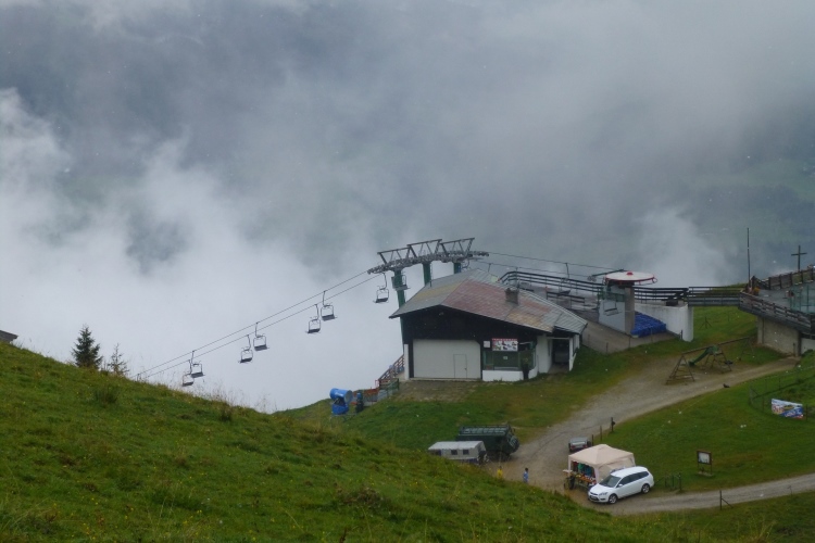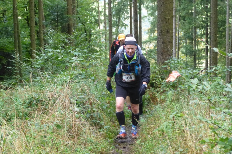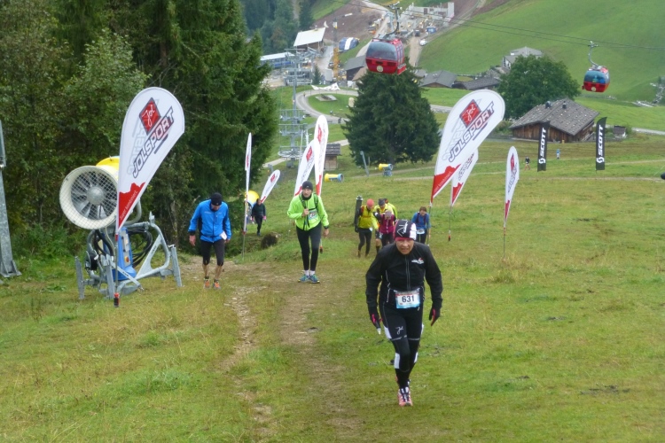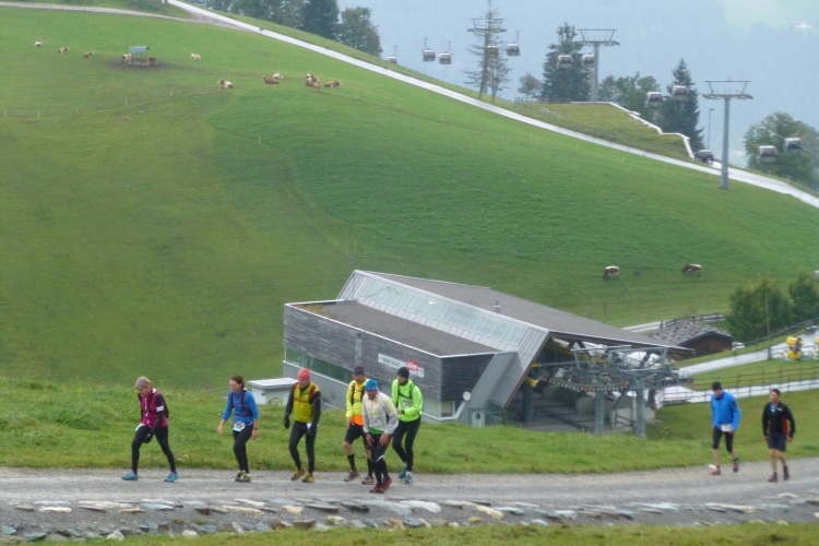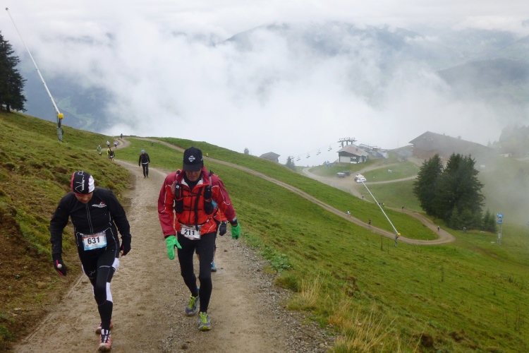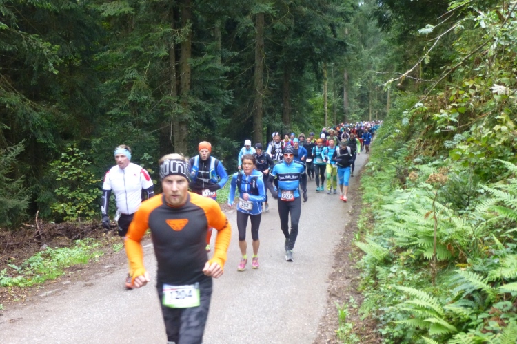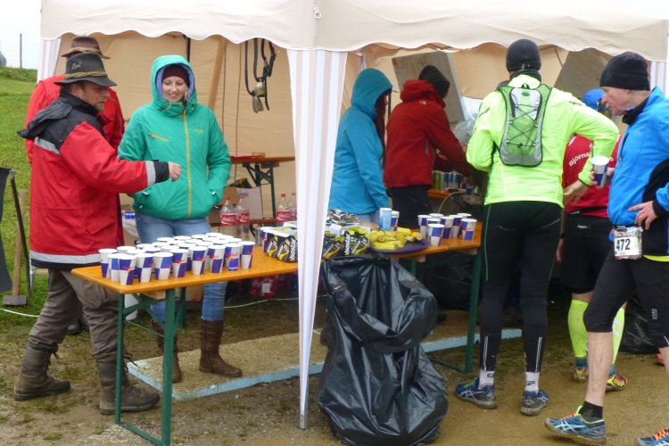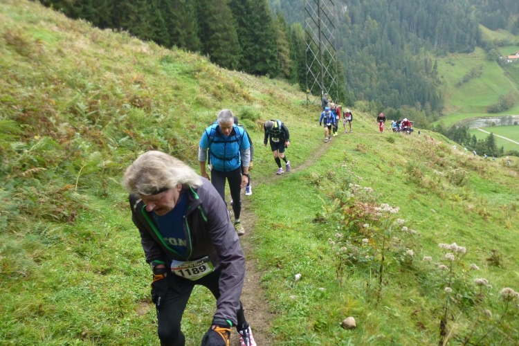 Darauf eingestellt bin ich schon, dass der Anstieg ein paar ganz spezielle Passagen bereit hält. Und eine solche erwartet uns gleich hinter dem 36 km-Schild. Direkt und schnurgerade geht es über das schon matschige Gras die steile „schwarze“ Skipiste empor. Fahnen säumen wie Slalomstangen den Weg. Der Vorteil: Wir gewinnen schnell an Höhe und Ausblick. Der Nachteil: Die Wolken von oben kommen ebenso schnell wieder näher. Fast 20 Minuten bin ich bis zur nächsten Kilometermarke unterwegs. Es beruhigt mich ein wenig, dass die meisten anderen auch nicht schneller sind.