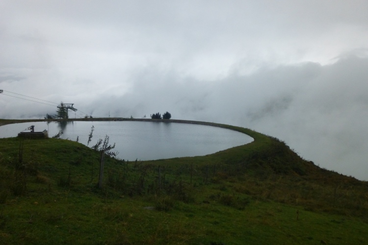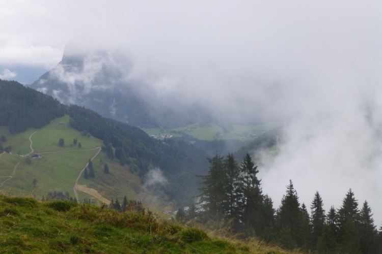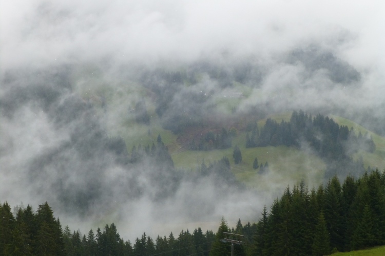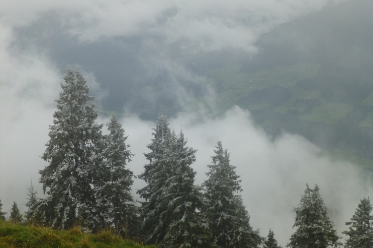 Weiter schlängelt sich unser Weg durch die Almen. Immer mal wieder sehe ich Wegmarkierungen, die die verbleibende Wanderzeit zum Gipfel angeben. Klingt überschaubar! Vom wolkenumwogten unsichtbaren Gipfel hört man auch schon die Willkommensrufe des nimmermüden Zielmoderators herab schallen. Wir aber laufen vorbei und nehmen einen anderen Weg. Auf diese Weise umrunden wir den Pölvengipfel fast vollständig, ohne uns ihm entscheidend anzunähern. Über wie unter uns wabern die Wolkenfelder und hüllen die Wälder und Liftanlagen der Umgebung zunehmend wieder ein. Auf der Rigialm (1532 m üNN) bekomme ich ein letztes Mal heißen Tee und bereite mich im Getanze der Schneeflocken emotional darauf vor, auf den letzten beiden Kilometern nochmals 300 Höhenmeter bewältigen zu müssen.