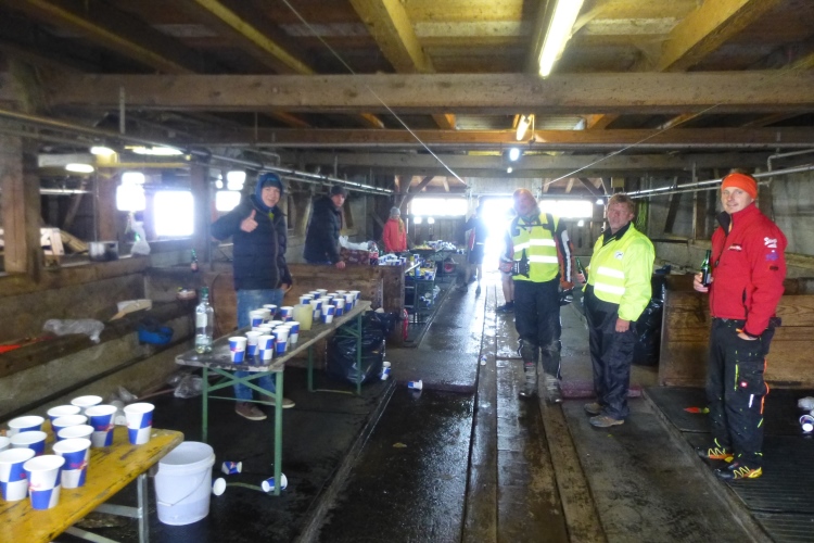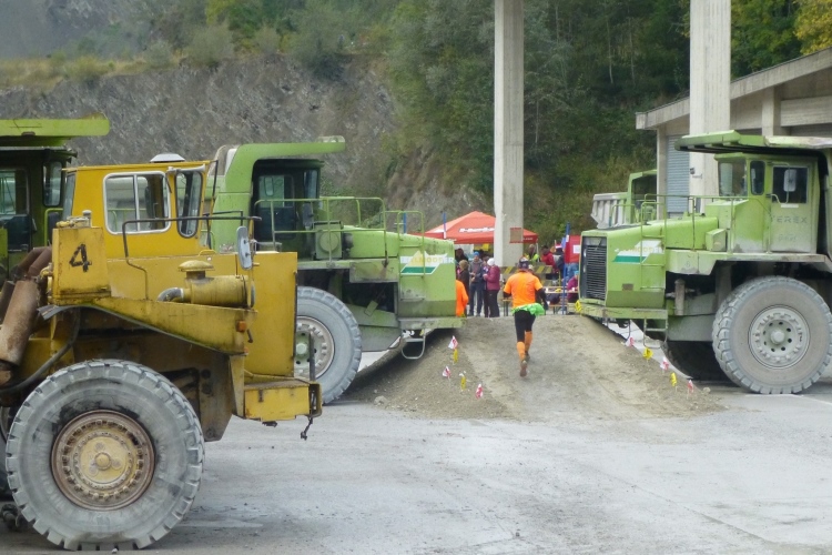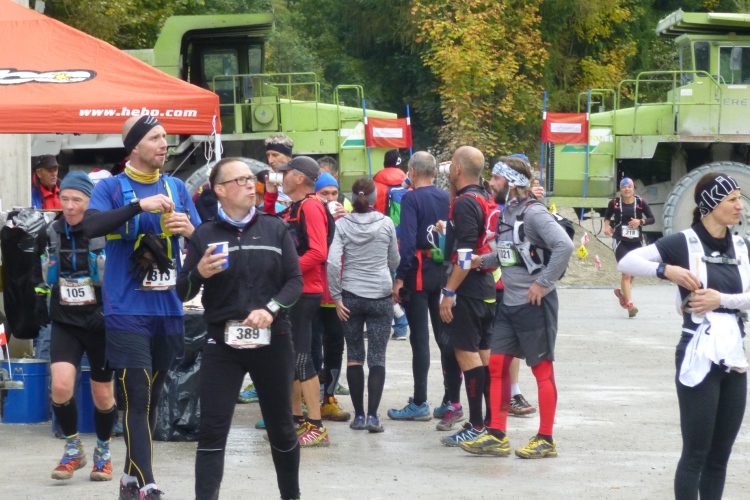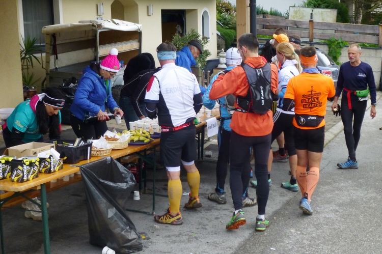 Anders als früher führt der Weg im weiteren Verlauf aber nicht mehr nach dem Motto „kurz und heftig“ binnen drei Kilometern direkt zum Gipfel. Wir müssen uns mehr gedulden – und auch leiden. Konkret schaut das so aus, dass wir ab km 37 auf einem Wirtschaftsweg erneut zum Laufen animiert werden. Dass es dabei auch wieder abwärts geht, erfreut mich eingedenk der damit zunehmenden Entfernung vom Gipfel nicht wirklich. Originell ist zumindest die Labestation bei km 37. Sie ist in den Boxen eines Kuhstalls untergebracht und unser Weg führt mittendurch.
