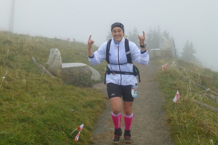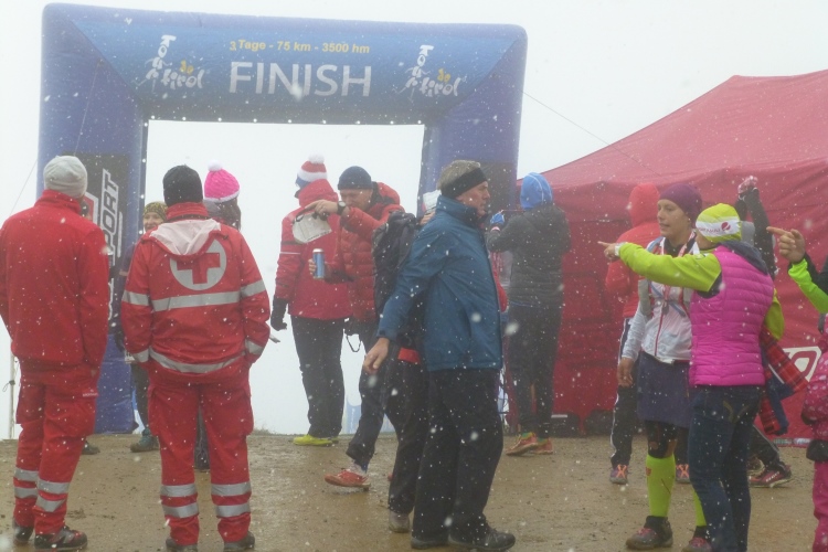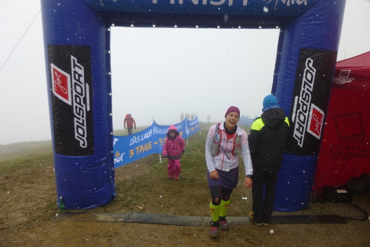 Vorfreude auf den Gipfel keimt auf, aber so richtig Spaß will bei dieser Witterung und Sicht beim finalen Gipfelsturm nicht aufkommen. Hauptsache ankommen, lautet die Minimaldevise. Es geht weiter auf dem Wirtschaftsweg, Schritt für Schritt. Nur vereinzelt tröpfeln die Läufer dahin und von Wolken eingehüllt wird das Gefühl der Einsamkeit noch verstärkt. Über einen schmalen Pfad werden wir auf eine Wiesenrampe gelotst und da erst sehe ich nun greifbar nahe den blauen Zielbogen durch die Wolkensuppe schimmern. Mit aufmunternden Worten werden die Ankömmlinge vom Zielsprecher begrüßt und den erschöpften Gesichtern zumindest ein Lächeln entlockt. Mit ausgelassener Freude tun sich die meisten schwer – sie sind, wie ich, einfach nur froh, diese Herausforderung gemeistert zu haben. Der Zieltrubel ist witterungsbedingt denn auch nur ein sehr bescheidener. Der Kälte und dem dichten Schneetreiben in 1.829 m Höhe entfliehen die Ankömmlinge sogleich in den geschützten Zielversorgungsbereich oder direkt in die warme Stube des Bergrestaurants.