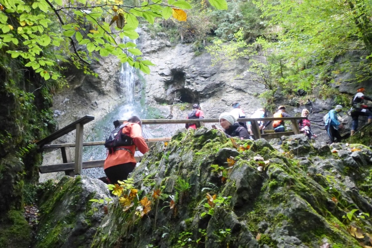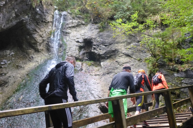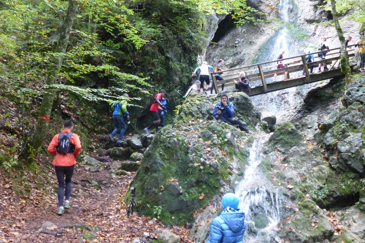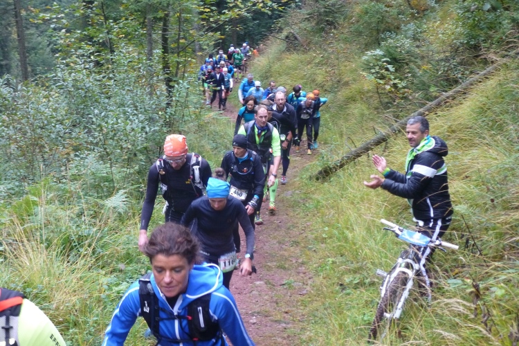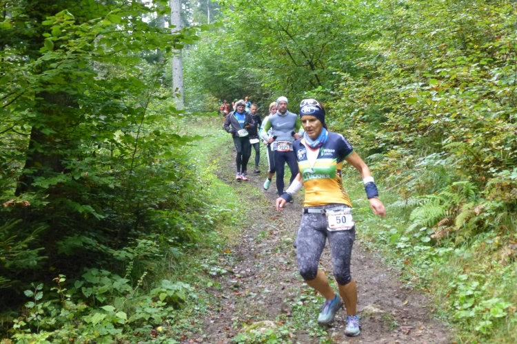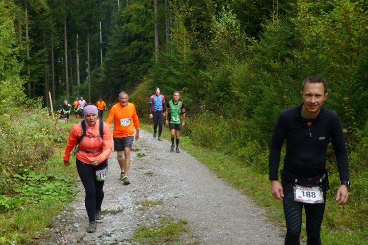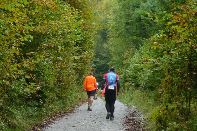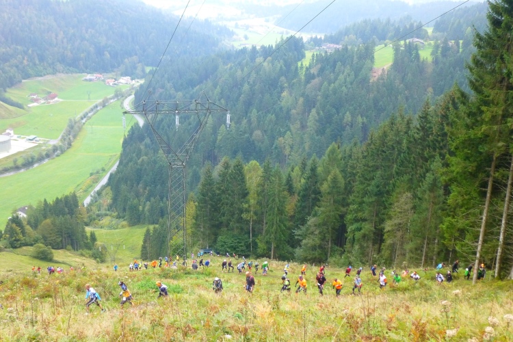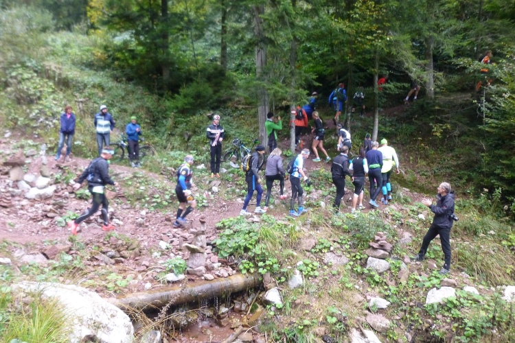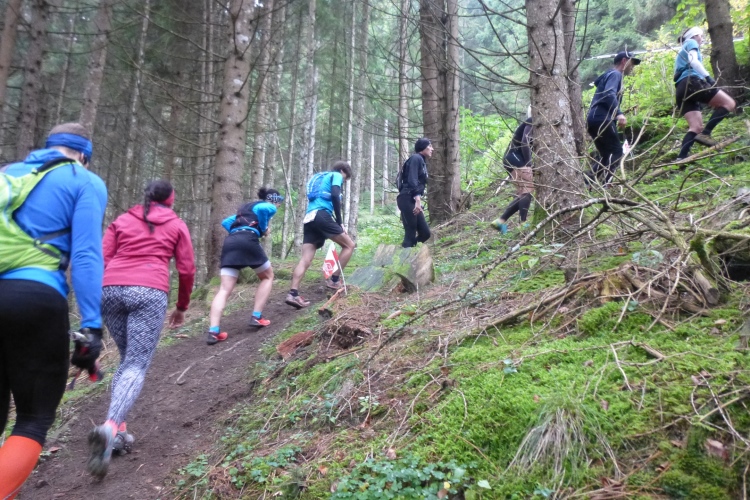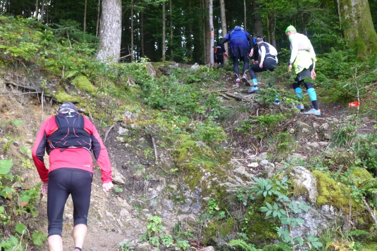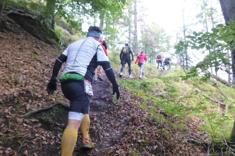 Den Streckenkurs des Pölven Trial kann man in Kürze ganz einfach charakterisieren: Einmal um den Pölven rum, einmal bis auf fast 1.200 m rauf, viiiiel Wald und viiiiele profilierte Single-Trails. Aber ein bisschen mehr gibt es schon noch zu erzählen.Viel Schonzeit wird uns nach dem Start nicht gewährt. Sogleich geht es bergan, nicht steil, aber beständig, zunächst auf Asphalt, dann auf einer Forststraße durch den Wald. Meine Beine sind schwer, ich keuche und fluche vor mich hin – was habe ich mir da angetan! Aber jetzt schon zu marschieren will ich schon aus Gründen meiner „Läuferehre“ nicht zulassen und so lasse ich mich von der Meute einfach mitziehen. Der Weg wird schmaler und vor einem zu querenden Bächlein bildet sich gar ein kleiner Rückstau, da es jenseits des Bachs unwegsam steil nach oben geht. Cheforganisator Martin Kaindl persönlich assistiert beim Queren des Nadelöhrs. Mir kommt die Zwangspause gerade recht. Und siehe da – es geht gleich besser. Vielleicht liegt es auch an dem schönen Singletrail, der zwar wurzelig, aber auf weichem Waldboden fast schon abenteuerlich im Wechsel rauf und runter dahin führt.