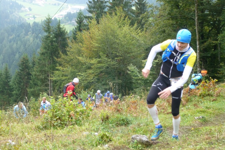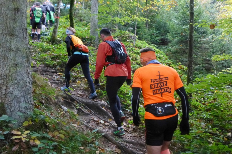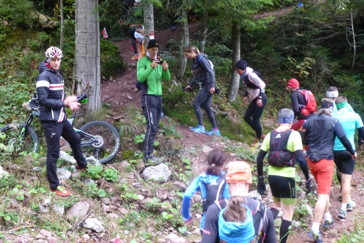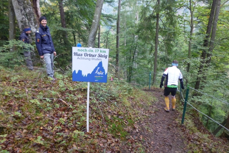 Eine Verschnaufpause wird uns danach nur kurz gegönnt, schon schwingt sich der Waldpfad zu neuen Hoch- wie Tiefflügen auf. Da lacht das Trailerherz. Am Eingang zum Hias Ortner Steig wacht ein Bergwachtler darüber, dass nicht einer der Läufer unfreiwillig den steilen Abhang hinunter purzelt. „Chill out“ ist zwischendurch durch einige Wiesenpassagen eingebaut, aber ehe man sich versieht, zweigt der Weg auch schon wieder gen Bergwald ab.