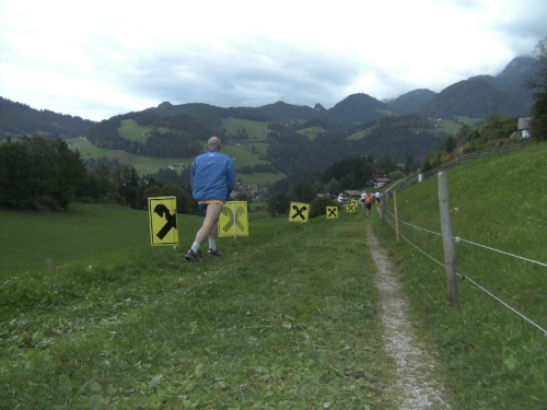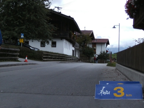 Ausgeschildert ist für uns ein 2,5 Kilometer langer Rundkurs, den ich gleich zum Einlaufen hernehme. Die jeweiligen Kilometerschilder sind bereits aufgestellt. Vier flache Runden sollen es sein, aber man meint wohl „tirolerisch flache“ Runden. Die Runde weist einige Wellen auf, besonders zum Wendepunkt geht’s bergan. Ja, und auf der zweiten Hälfte der Runde kommt ein kurzes Stück mit Grasbelag und Wurzeln. MeineTaktik: Ich will den Zehner schnell hinter mich bringen.
