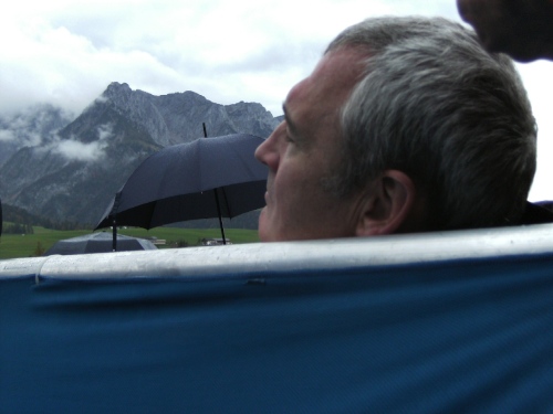 Etwa bei Kilometer 3 finden wir eine Verpflegungsstelle, da bleibe ich stehen und fotografiere. Ich ernte ein Kopfschütteln bei einer Zuschauerin und vernehme: “Der hat Zeit zum Fotografieren!“ Durch Oed hindurch, am Lampfhof vorbei mit leichter Steigung und anschließendem Gefälle beende ich Runde eins mit einigen weiteren Fotostopps. Gut fünf Minuten pro Kilometer höre ich einen Gegner murmeln. Am Moderatorenzelt weise ich den Stefan Steinacher an, den Wasserhahn da oben zuzumachen. Den Befehl lässt er dann über sein Mikro los. Und es hilft später.