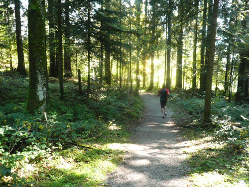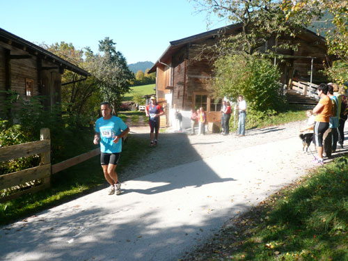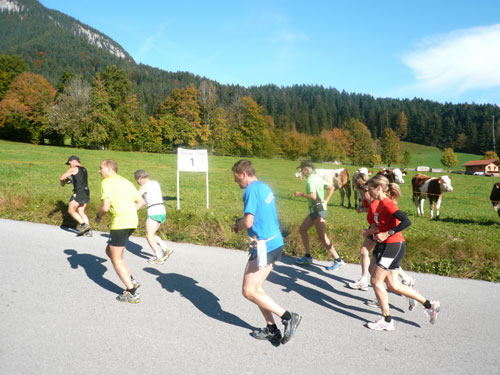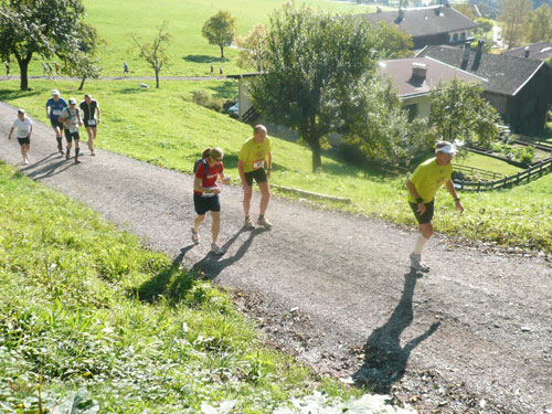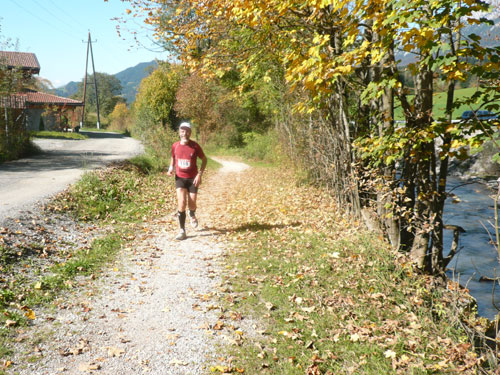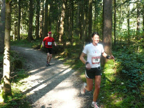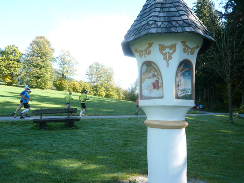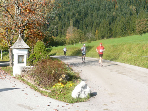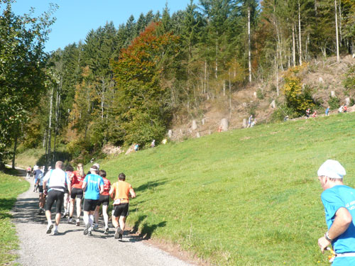 Im Ort zurück sind 7 km geschafft. Auf dem Höhenprofil des Veranstalters sieht dieser erste Abschnitt recht flach aus, da sollte man sich aber nicht täuschen lassen, es geht meistens entweder leicht auf oder ab. Und im gleichen Stil führt uns der Weg weiter, nicht sonderlich spektakulär, aber die teilweise doch längeren nur mäßigen Aufwärtsstücke sind im Tempo schon leicht spürbar. Nicht ganz unerwartet haben wir dann bei der HM-Marke doch bereits 400 hm aufwärts und fast 300 abwärts hinter uns gebracht.