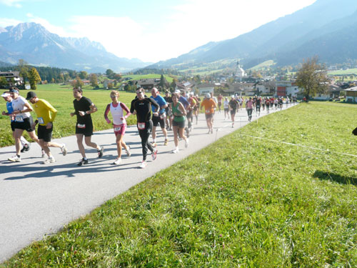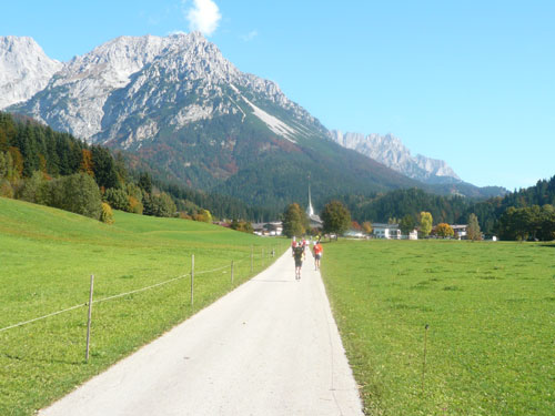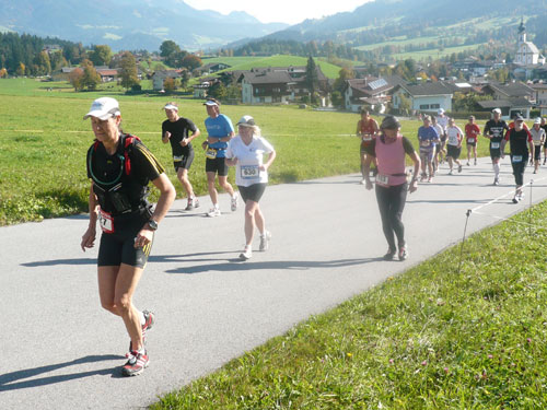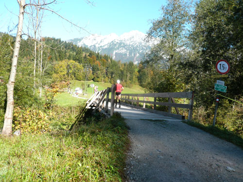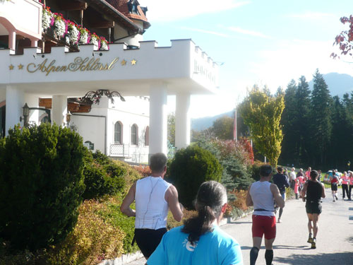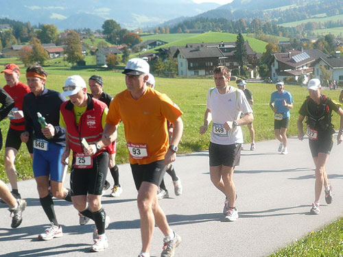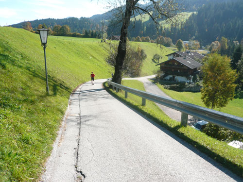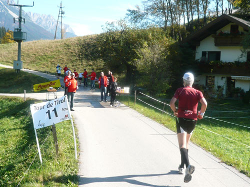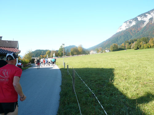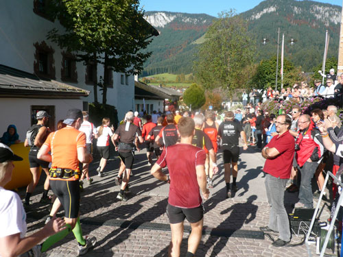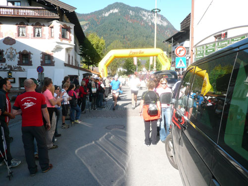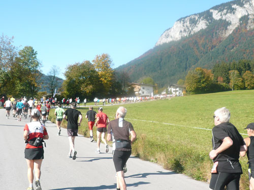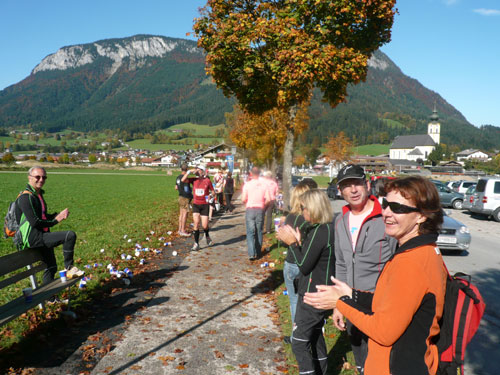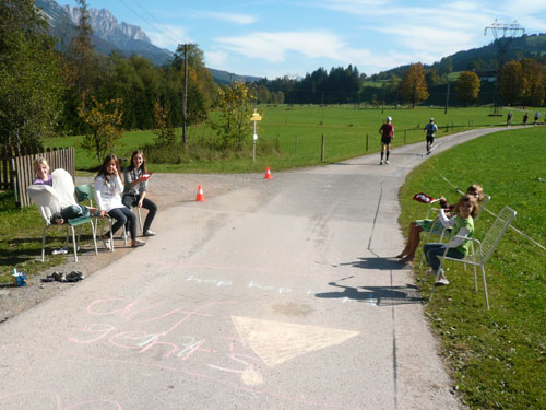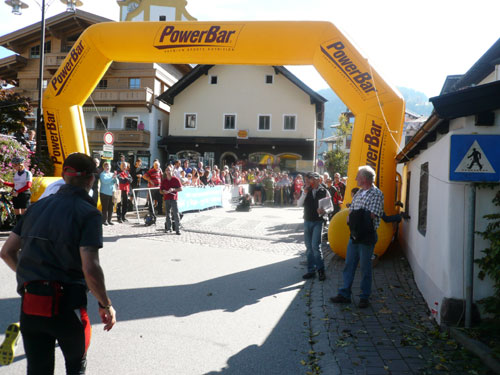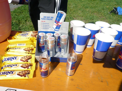 Verblüfft bin ich darüber, dass exakt an der Zeitmessmatte der Halbmarathonmarke der Anstieg in den alpinen und rustikaleren Teil unseres Marathons beginnt. Wie die Streckenvermesser das wohl hinbekommen haben? Oder alles nur reiner Zufall? Direkt neben der Talstation der Hartkaiserbahn in Ellmau ist für uns der Einstieg in die richtige Bergwelt. Aber vorher können wir uns noch mal anständig verpflegen und Energie tanken. Ich glaube erstmals heute gibt es die komprimierte Red Bull Variante, den Energy Shot. Das kleine Fläschen soll die gleiche Wirkung haben wie eine große Dose und auch eine ähnliche Wirkung wie Energie Gels erzeugen. Daher probier ich es jetzt aus. Einen Vorteil gegenüber Gels kann ich sofort ausmachen, es ist ruckzuck verschlungen und das ist schon mal wesentlich positiver wie das Gel-Runtergewürge.
