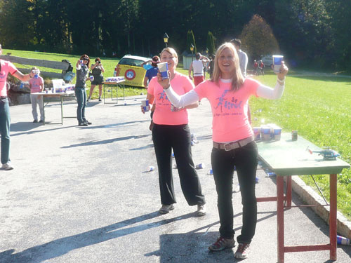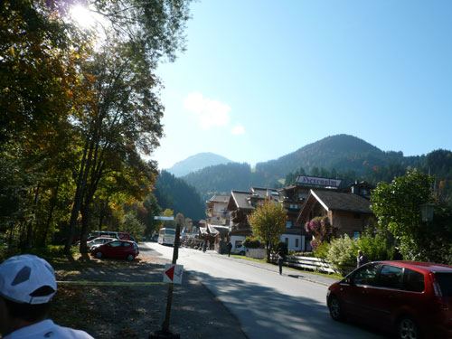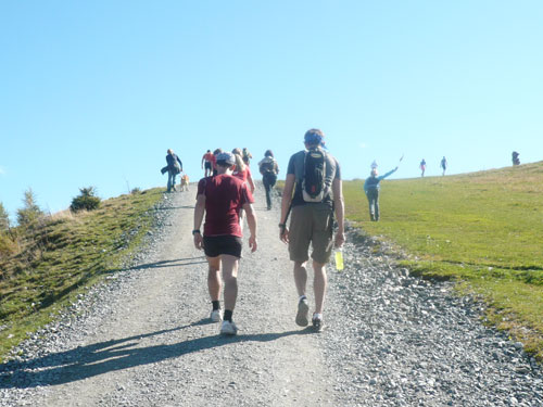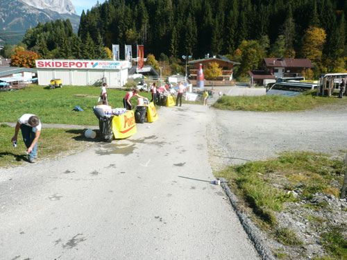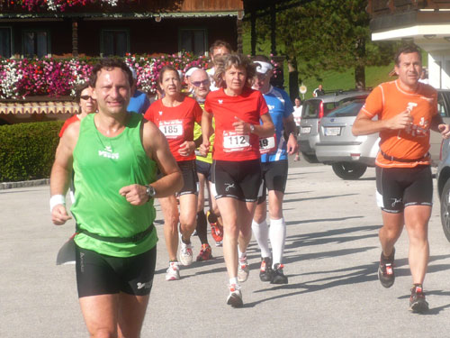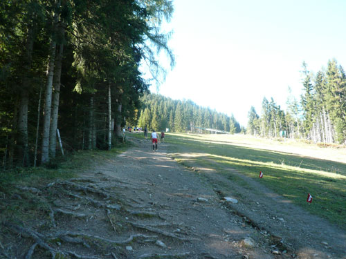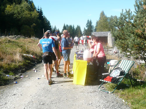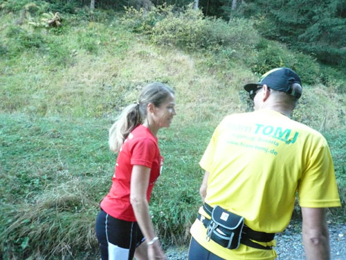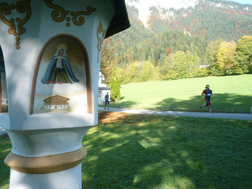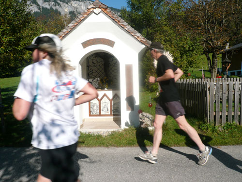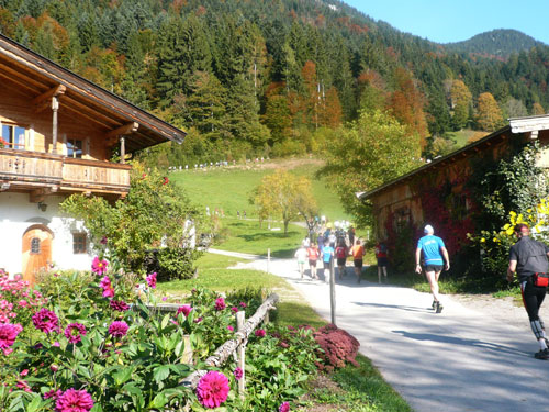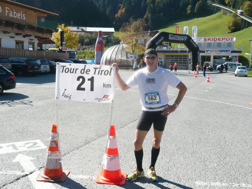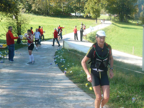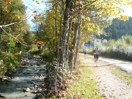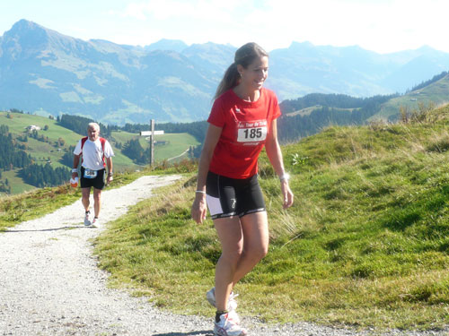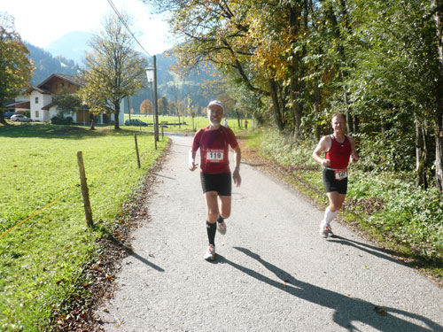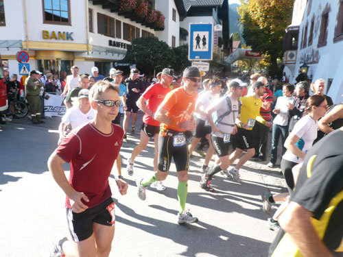 Verblüfft bin ich darüber, dass exakt an der Zeitmessmatte der Halbmarathonmarke der Anstieg in den alpinen und rustikaleren Teil unseres Marathons beginnt. Wie die Streckenvermesser das wohl hinbekommen haben? Oder alles nur reiner Zufall? Direkt neben der Talstation der Hartkaiserbahn in Ellmau ist für uns der Einstieg in die richtige Bergwelt. Aber vorher können wir uns noch mal anständig verpflegen und Energie tanken. Ich glaube erstmals heute gibt es die komprimierte Red Bull Variante, den Energy Shot. Das kleine Fläschen soll die gleiche Wirkung haben wie eine große Dose und auch eine ähnliche Wirkung wie Energie Gels erzeugen. Daher probier ich es jetzt aus. Einen Vorteil gegenüber Gels kann ich sofort ausmachen, es ist ruckzuck verschlungen und das ist schon mal wesentlich positiver wie das Gel-Runtergewürge.