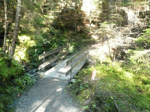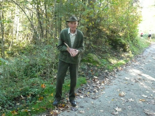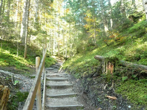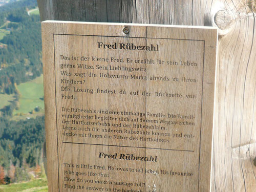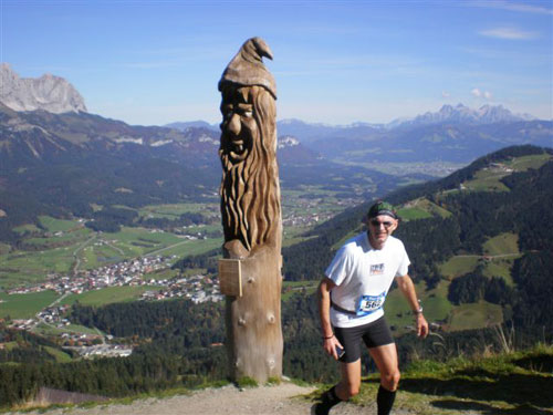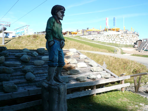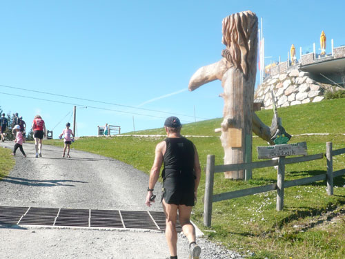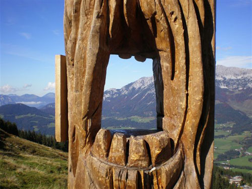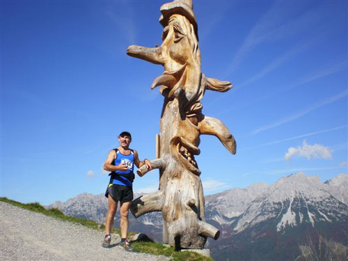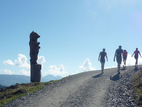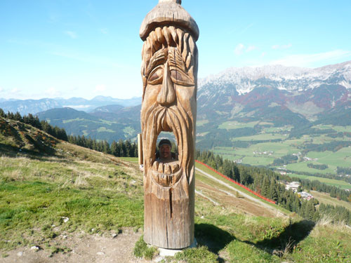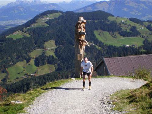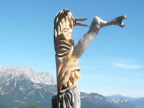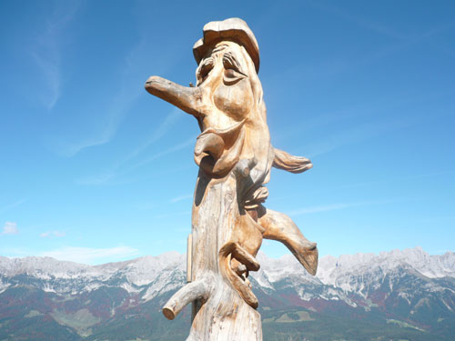 Also, packen wir’s an, bis zum Hartkaiser sind auf den nächsten 7 km fast 800 hm zu erkraxeln. Gleich geht es rein in den schattigen Wald, wo unser Weg auf wurzeligen und auch mit Treppen durchsetzten Trails steil nach oben führt. Weiter geht’s über die Ellmauer Ski-Talabfahrt zur Rübezahlalm, dort treffe ich auf Mario, der gerade am fotografieren ist. Was knipst der denn da? Es ist die erste von 22 Schnitzfiguren. Die folgenden 3 km werden wir auf Österreichs längsten Schnitzfiguren-Wanderweg zurücklegen. Allesamt eigenhändig vom Wirt der Rübezahl-Alm mit der Motorsäge erschaffen. 2007 wurde der Weg von Rennfahrer „Striezel“ Stuck eröffnet, ihm ist auch eine Figur gewidmet, die hab ich aber leider irgendwie übersehen.