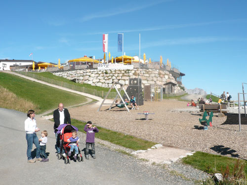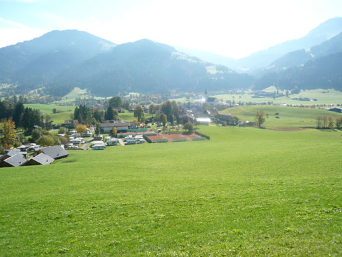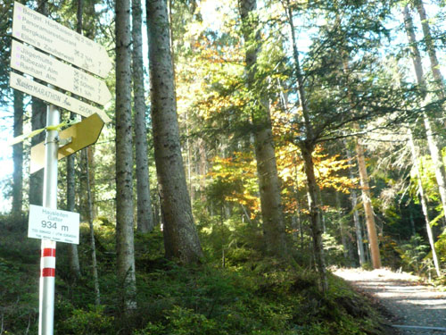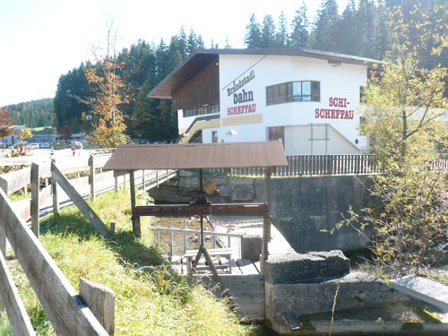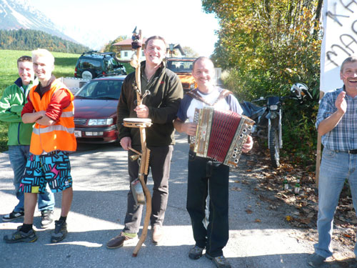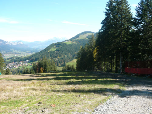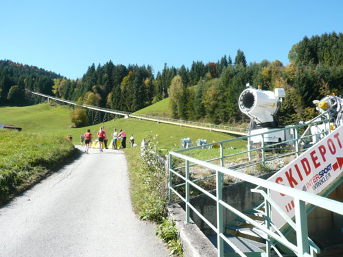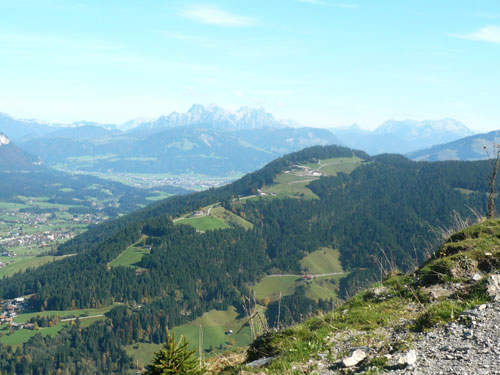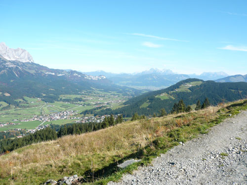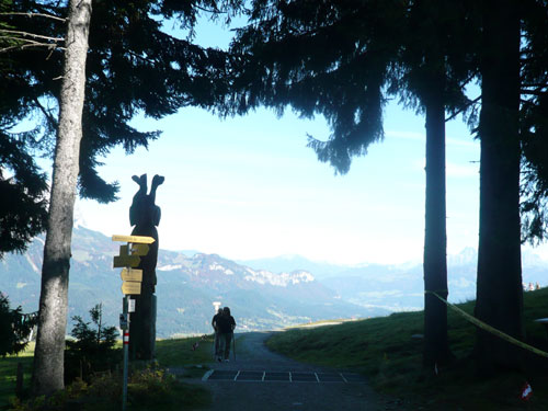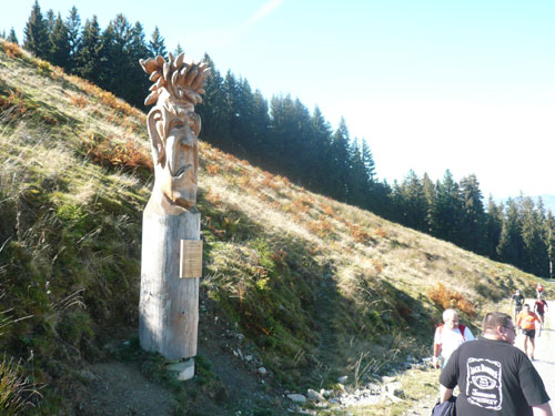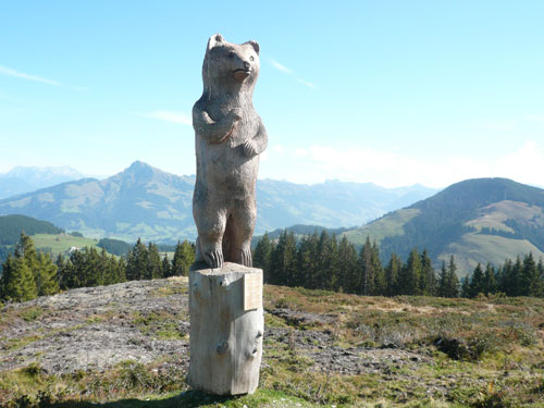Nach verlassen des Waldes bietet sich uns ein herrlicher Blick hinüber zum Wilden Kaiser. Alle paar hundert Meter können wir zudem eine neue Schnitzfigur bewundern. Da kommt für mich natürlich wieder einiges an Fotostopps zusammen, muss doch einige auslassen sonst komm ich ja nie nach oben. Mario konnte ich am Berg stehen lassen, wenig später kann ich Jan einholen, er nimmt sich auch gerade eines der Kunstwerke unter die Lupe und macht ein paar Bildchen. Eine Schnitzerei ist Bruno dem Bären gewidmet, der Seinerzeit bei uns in Bayern zum Abschuss freigegeben worden ist. Mir wäre lieber er könnte noch leibhaftig unter uns sein. Am Panoramarestaurant Bergkaiser ist es vorbei mit den Kunstwerken und auch dieser erste Steilabschnitt ist größtenteils bei km 28 erledigt.