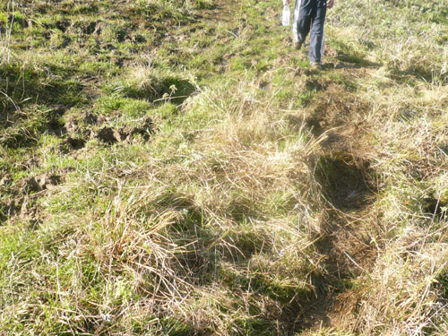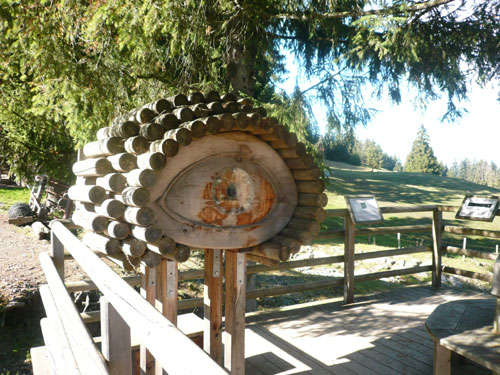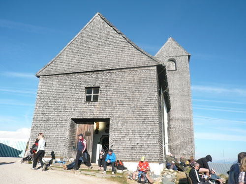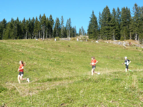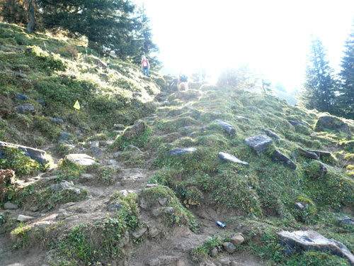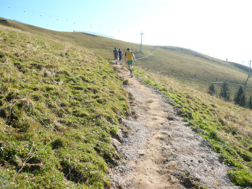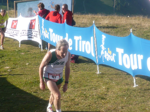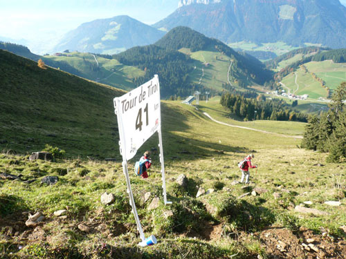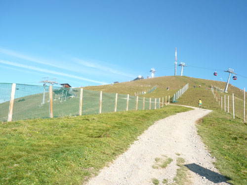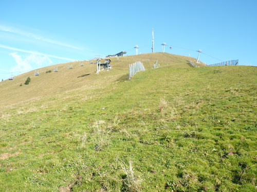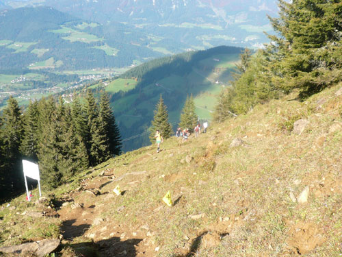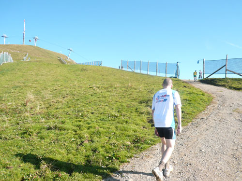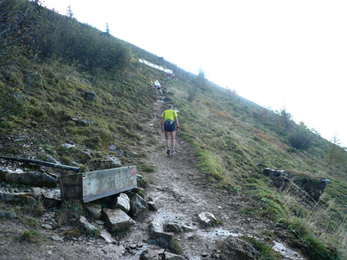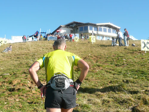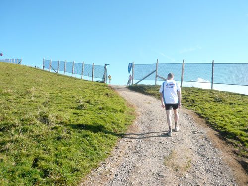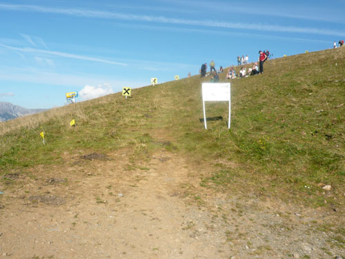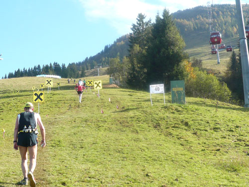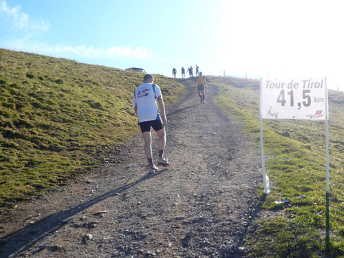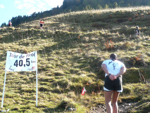 Am 39er-Schild zeigt meine Uhr 4:22 Std. Laufzeit an, das würde bedeuten dass ich mit einem 12 Minuten-Schnitt auf den Kilometer noch unter 5 Std. das Ziel erreichen könnte. Ein Blick zur Spitze hinauf lässt mich dann aber doch eher daran zweifeln, dass das machbar ist. An Laufen ist bis zur 40er-Markierung nur noch sporadisch für einige Meter zu denken, aber es lässt sich noch auf einem Kiesweg ganz gut marschieren. Damit Schluss ist aber endgültig als ich in die Wiese kurz vor dem Schild einschwenke. Wie bei einem Abfahrtskurs sind links und rechts unserer Strecke Markierungsfähnchen eingesteckt und es geht fast kerzengerade über’s Grün nach oben. Nur noch mühsam kann ich Meter für Meter aufsteigen, das pfeift jetzt so richtig rein und quetscht einem den letzten Rest Energie aus dem Körper. Ich habe momentan überhaupt kein Zeitempfinden mehr, wie schnell ich denn eigentlich unterwegs bin, das Finale furioso hat es knüppeldick in sich.