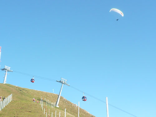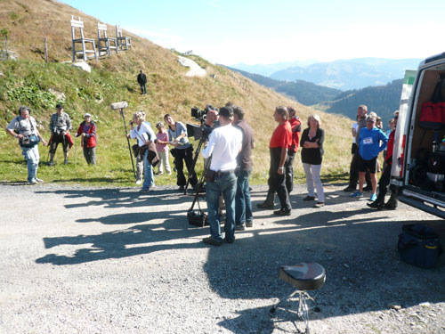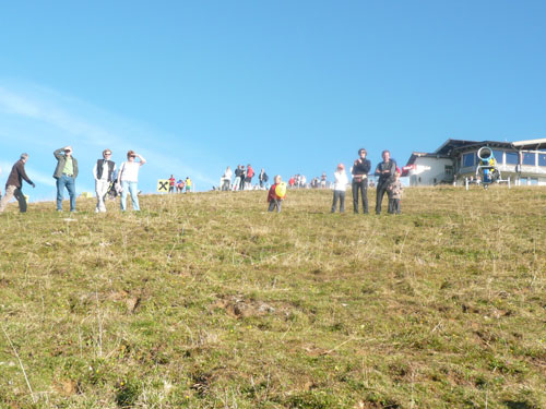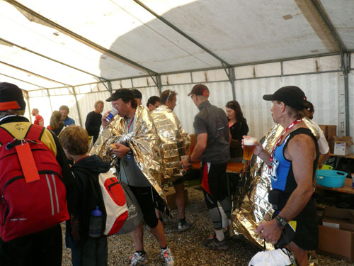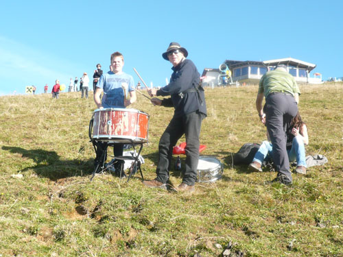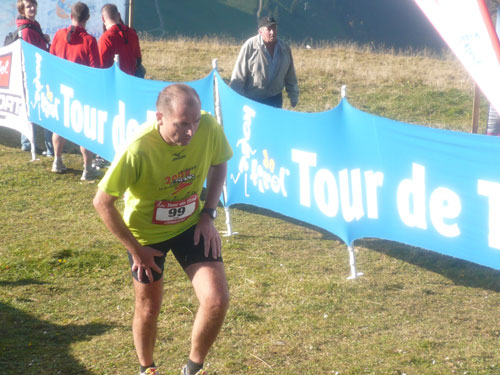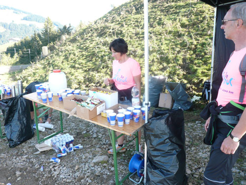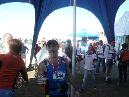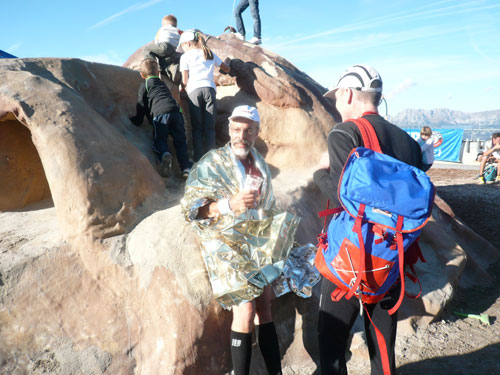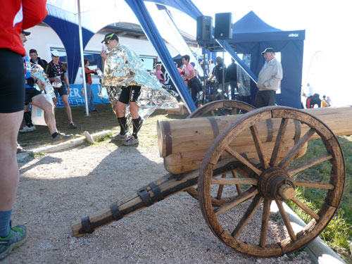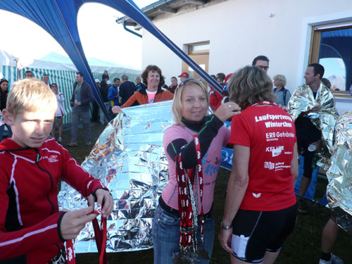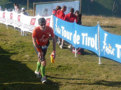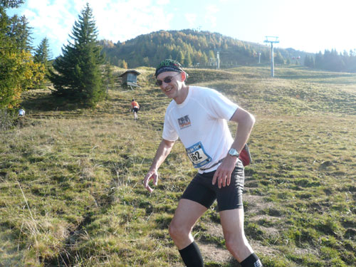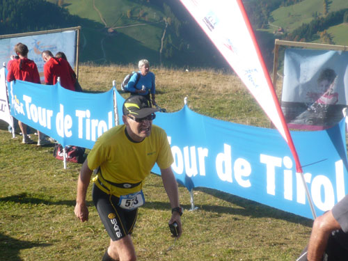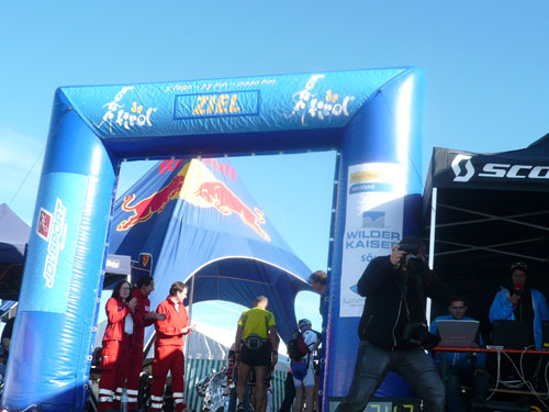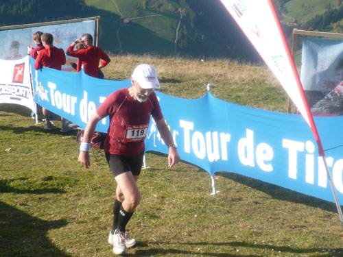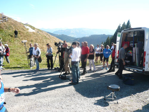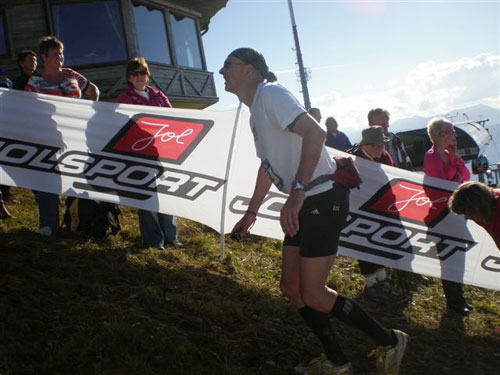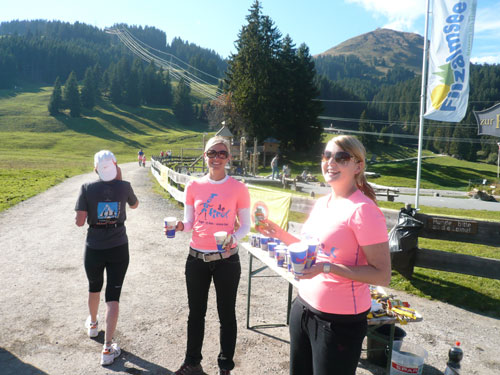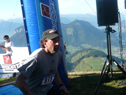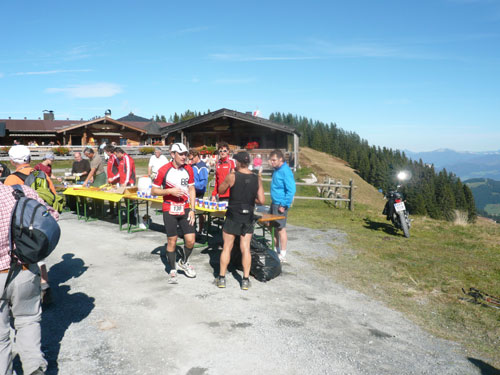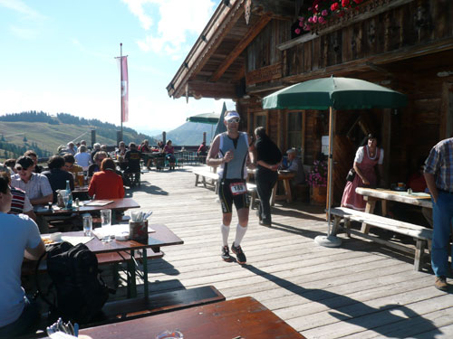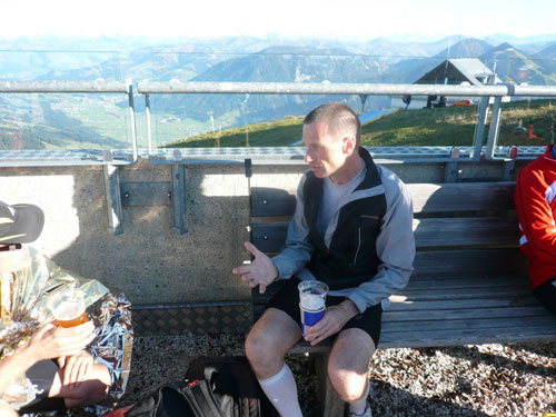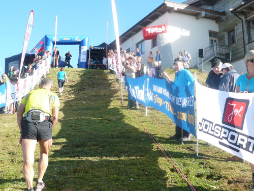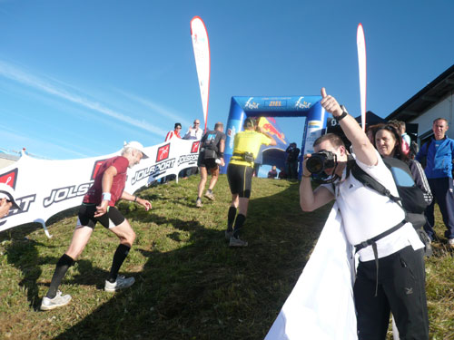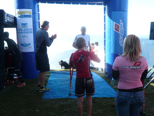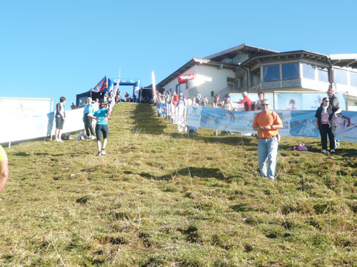 Die nächste Kuppe bringt uns wieder ins grelle Sonnenlicht und auf richtige Wege zurück. 41,5 km sind durch und beim Blick entlang der Liftanlage hinauf sind schon schemenhaft die Gipfelaufbauten zu erahnen. Auf den letzten 200 Metern geht’s noch einmal durch eine Wiese, angetrieben von einer Trommlergruppe und vielen Zuschauern die sich dieses Schlussspektakel nicht entgehen lassen. Ja, ich würde hier auch gerne mal sitzen und zuschauen wie denn die Spitzenläufer wie z.B. Jonathan Wyatt diesen Abschnitt bewältigen. Für mich und die Leistungsklasse unmittelbar vor und hinter mir ist das wieder nur im Schneckentempo zu absolvieren. Nach über einer Stunde für die letzten 3 km bin ich glücklich im Ziel, wo mir nach Medaille und Wärmefolie auch gleich ein Becher Erdinger überreicht wird. Das nenne ich doch einen Service. Jan wartet auch schon, wie immer hat er mir beim runter brettern einige Minuten abgenommen. Mario folgt 10 Minuten später, allesamt dachten wir ernsthaft daran die 5 Stunden-Grenze zu knacken, aber letztendlich waren wir dann doch weit weg. Eine Stunde, +/- 10 Min. je Leistungsniveau darf man schon in etwas ab km 39 einplanen. Im hinteren Bereich bekommen wir noch ein sehr schönes Finishershirt ausgehändigt und reichhaltige Verpflegung.