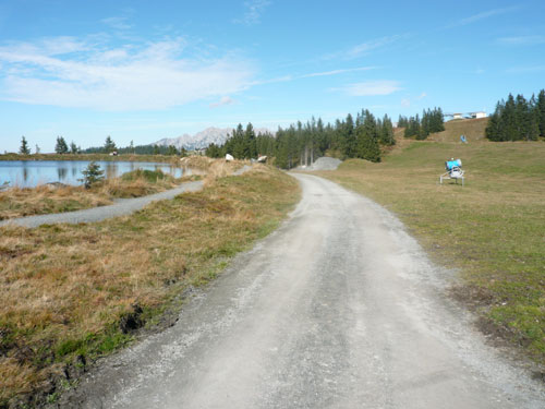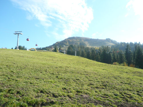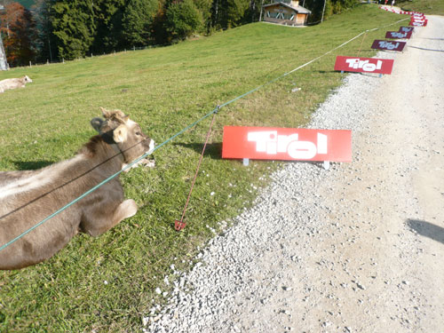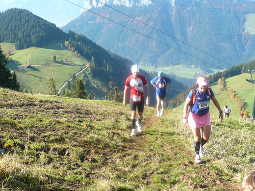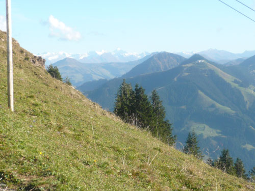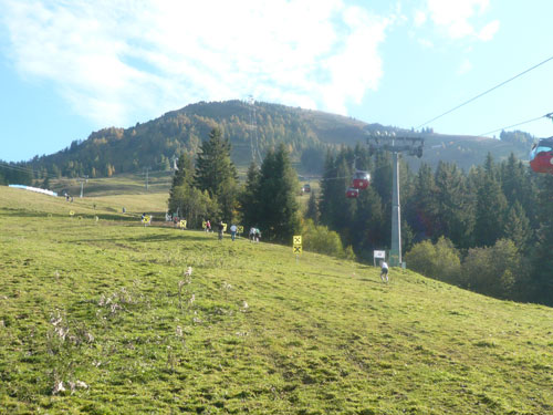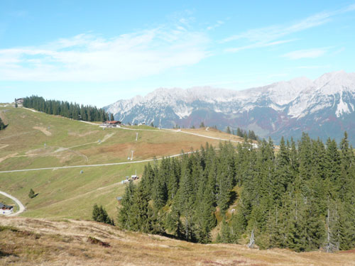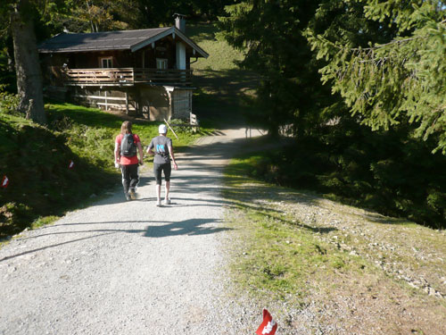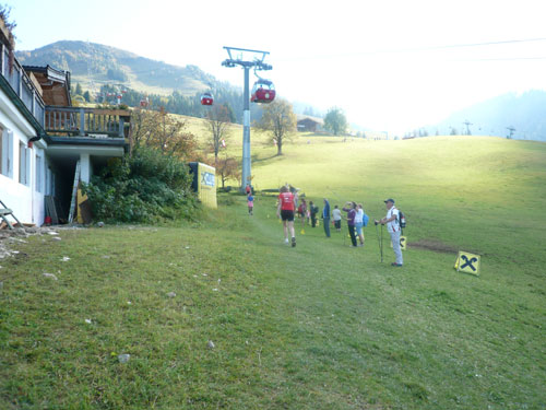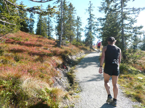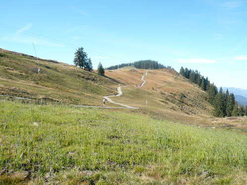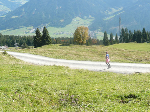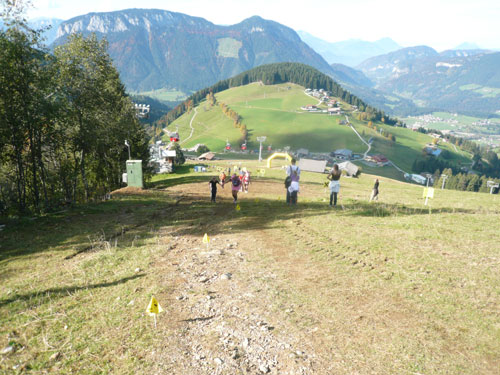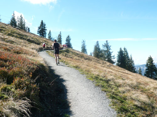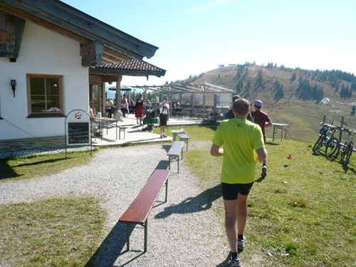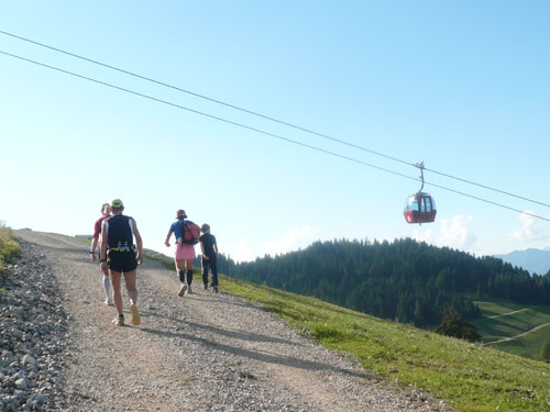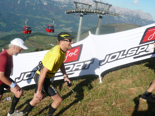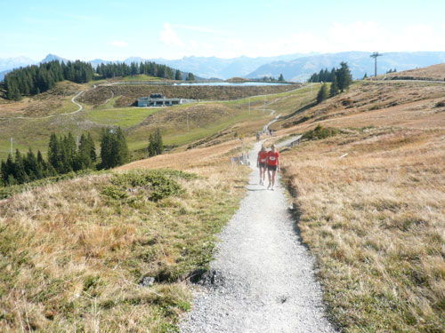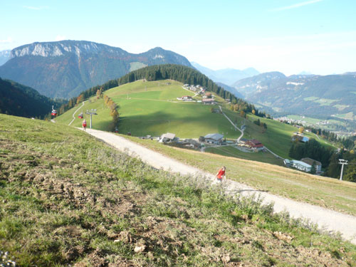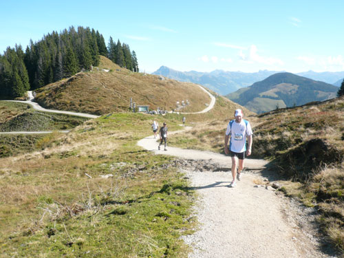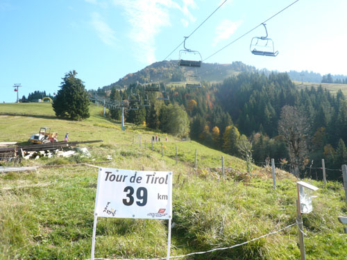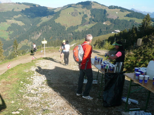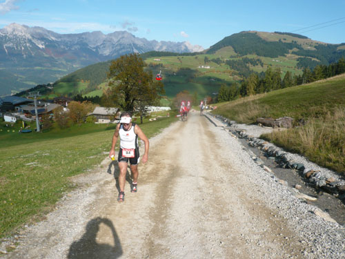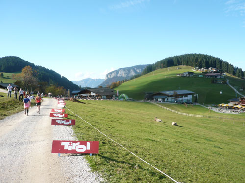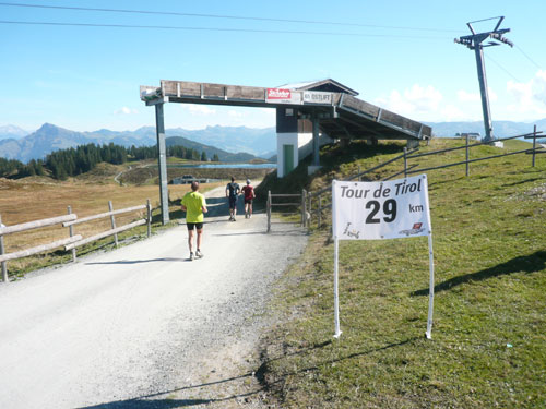 Ab km 31 darf an Laufarbeit wieder deutlich zugelegt werden, die nächsten 8 km führen bis Hexenwasser überwiegend bergab. Jan ist in seinem Element und kann sich in null Komma nix von mir absetzen, wie immer versuche ich erst gar nicht ihm runterwärts zu folgen. Auf unseren Laufwegen überqueren wir hauptsächlich die Skipisten der SkiWelt Wilder Kaiser – Brixental. Im Vorjahr und heuer bekam die Ski Arena die Auszeichung „bestes Skigebiet der Welt“. Ich kenne mich hier sehr gut aus, alles kommt mir bekannt vor. Früher war dies ein bevorzugtes Skigebiet für mein Winterfreizeitvergnügen, aber seit Beginn meiner Marathonkarriere komme ich leider kaum mehr zum Skifahren. 91 Lifte und Bahnen, 279 km Pistenspaß und 70 Einkehrschwünge verspricht die Headline des Skiwelt-Prospekts.